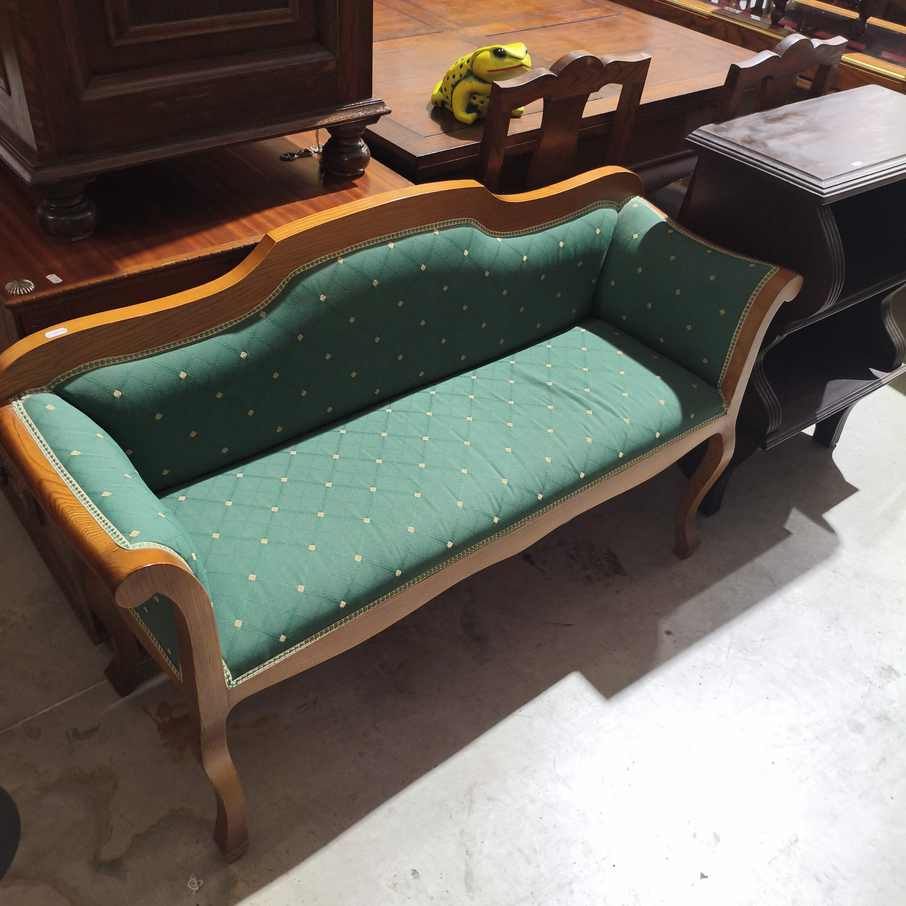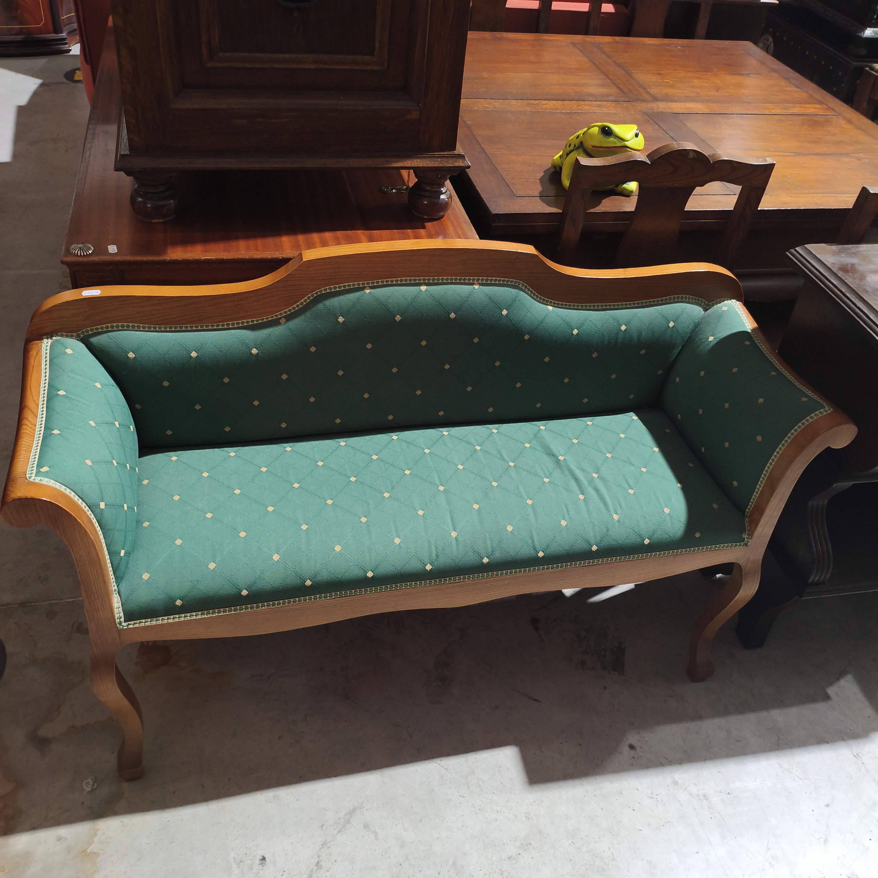 Canapé em madeira pinho mel e tecido verde.
