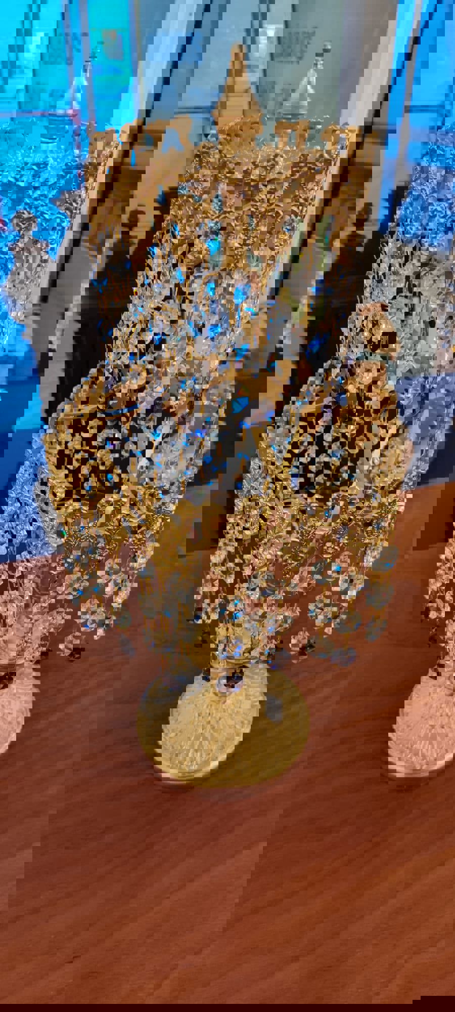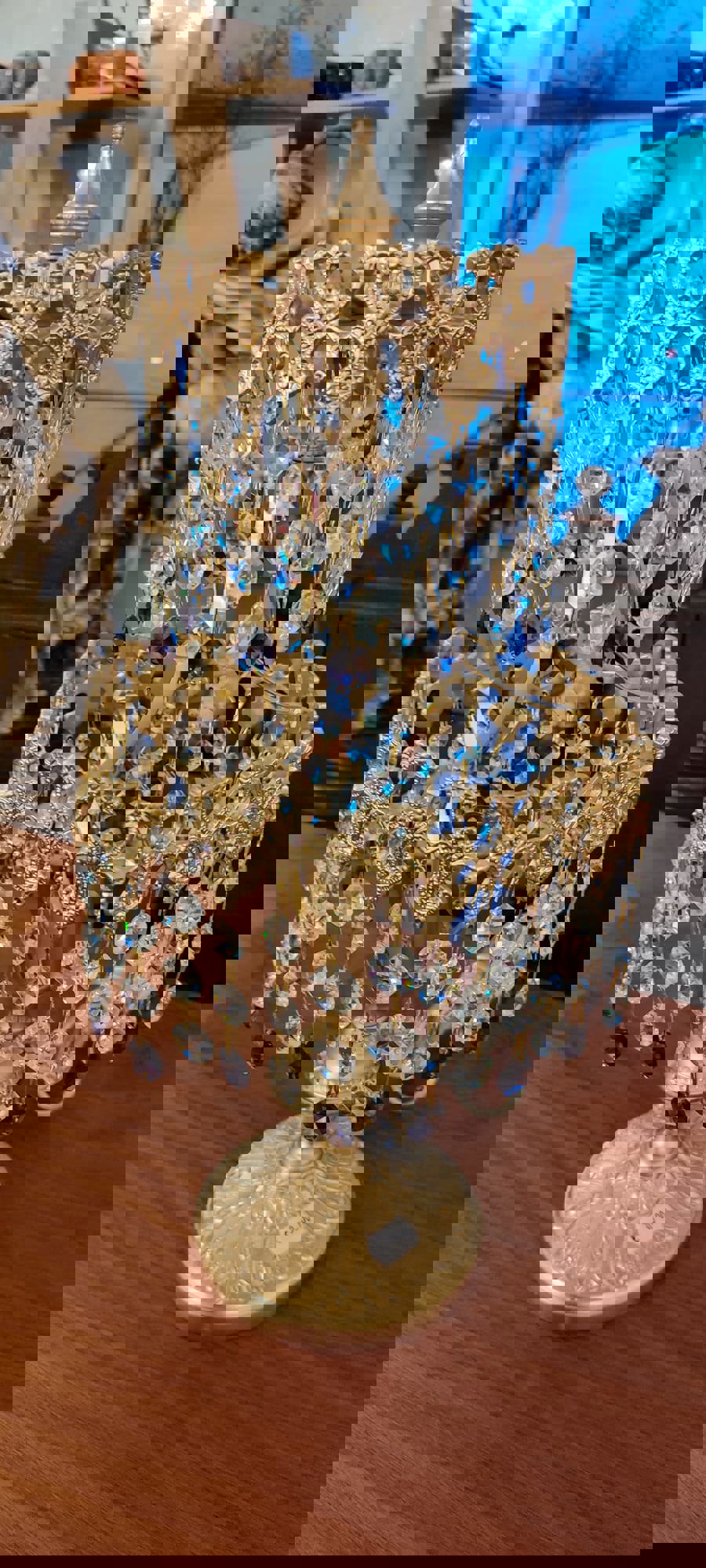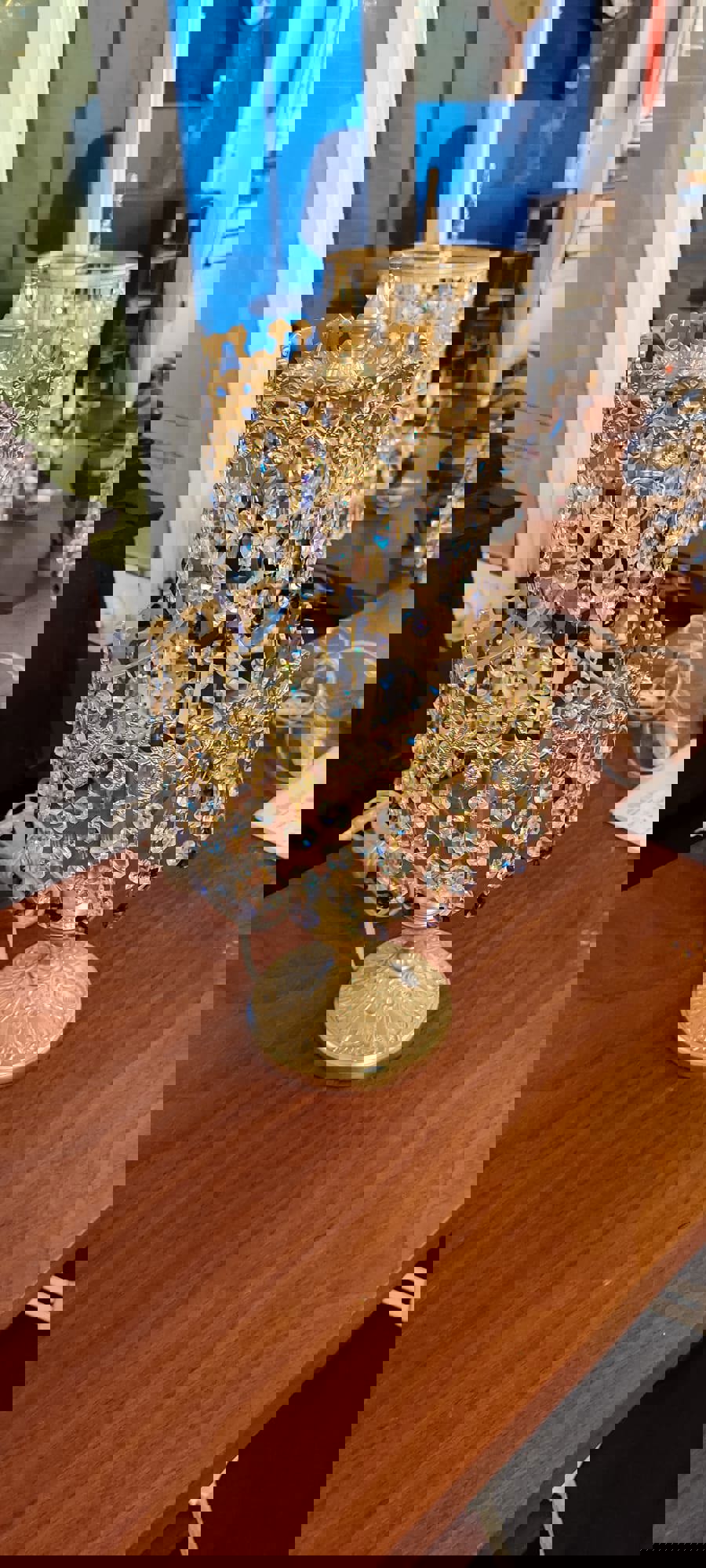 Candeiro em cristal, de mesa, dourado.