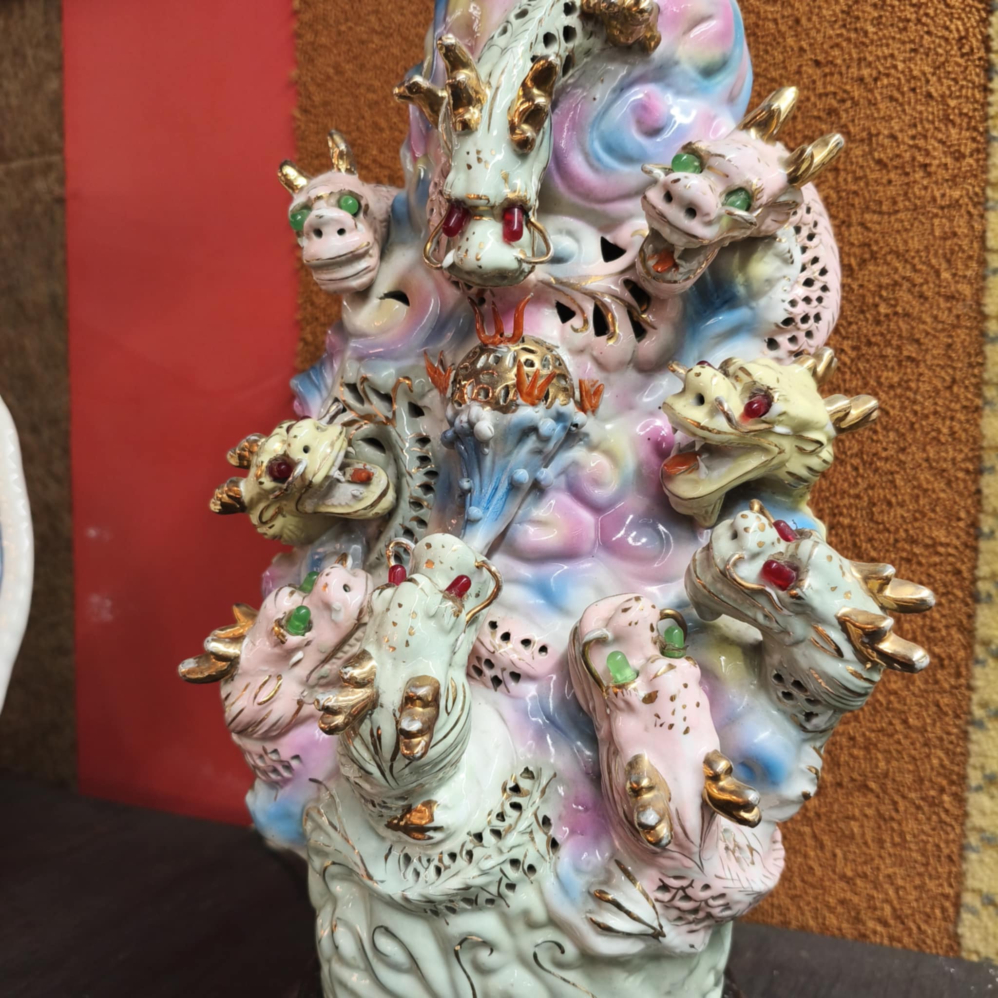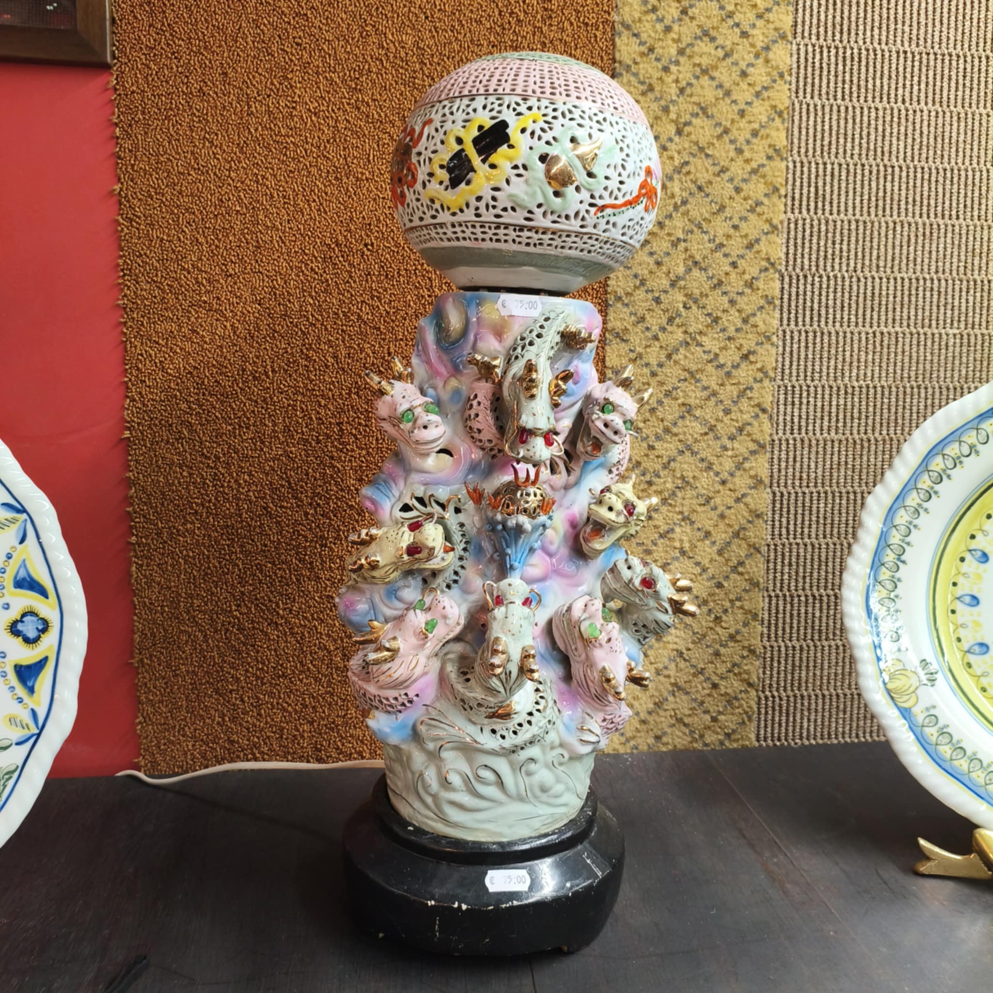 Candeeiro em forma de estatueta, oriental, com dragões. A parte de cima circular gira.