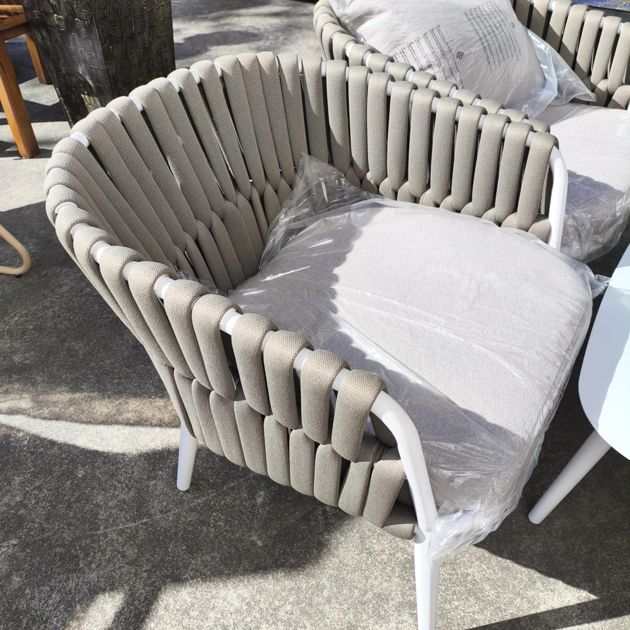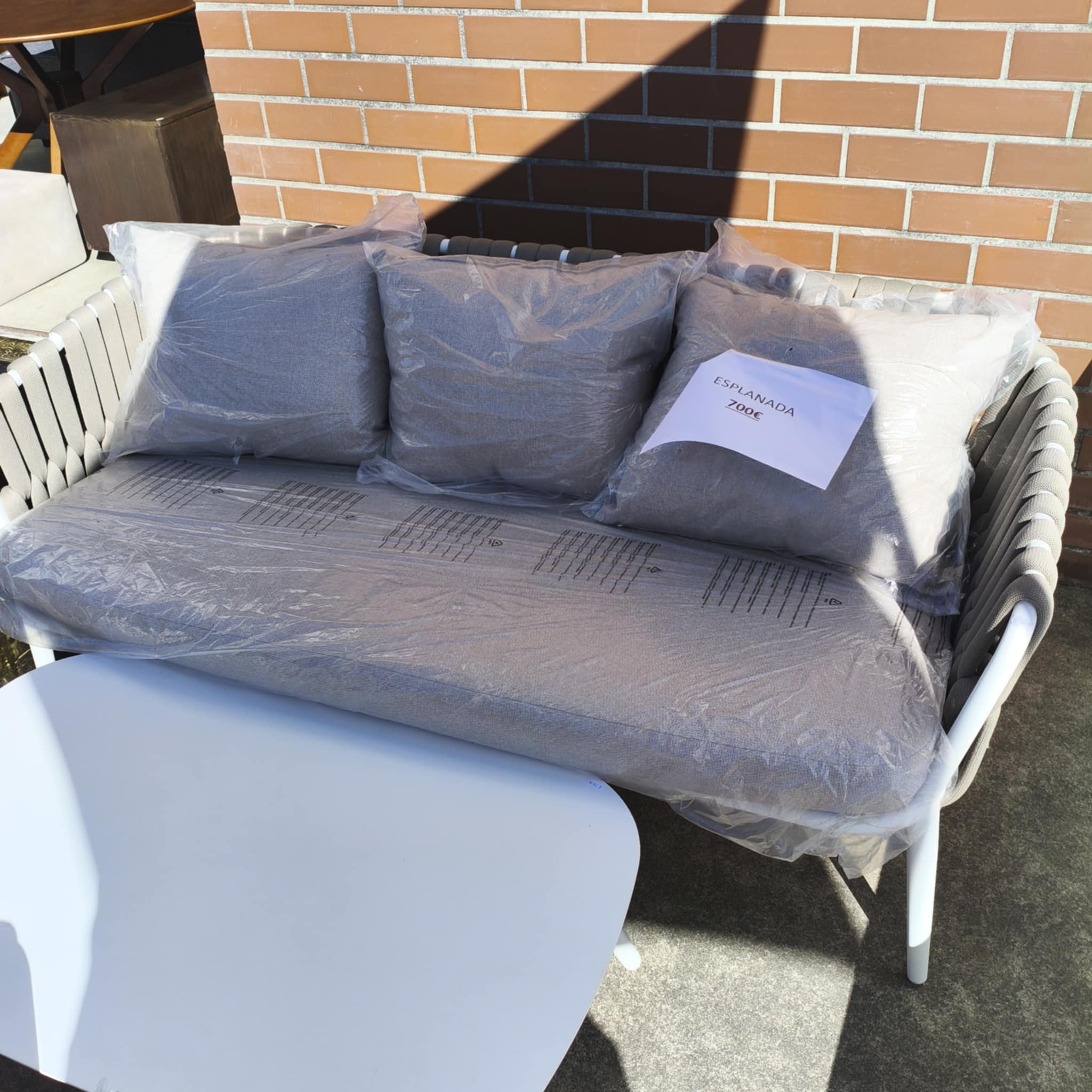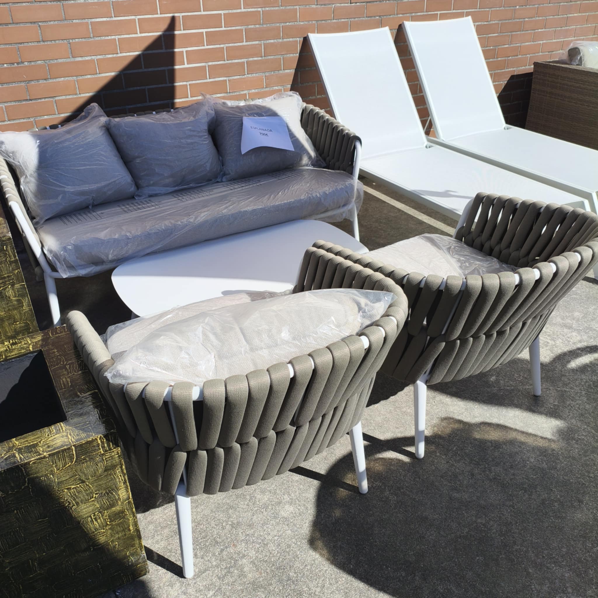 Conjunto esplanada de exterior, com 2 sofás individuais, 1 sofá de dois lugares e uma mesinha.