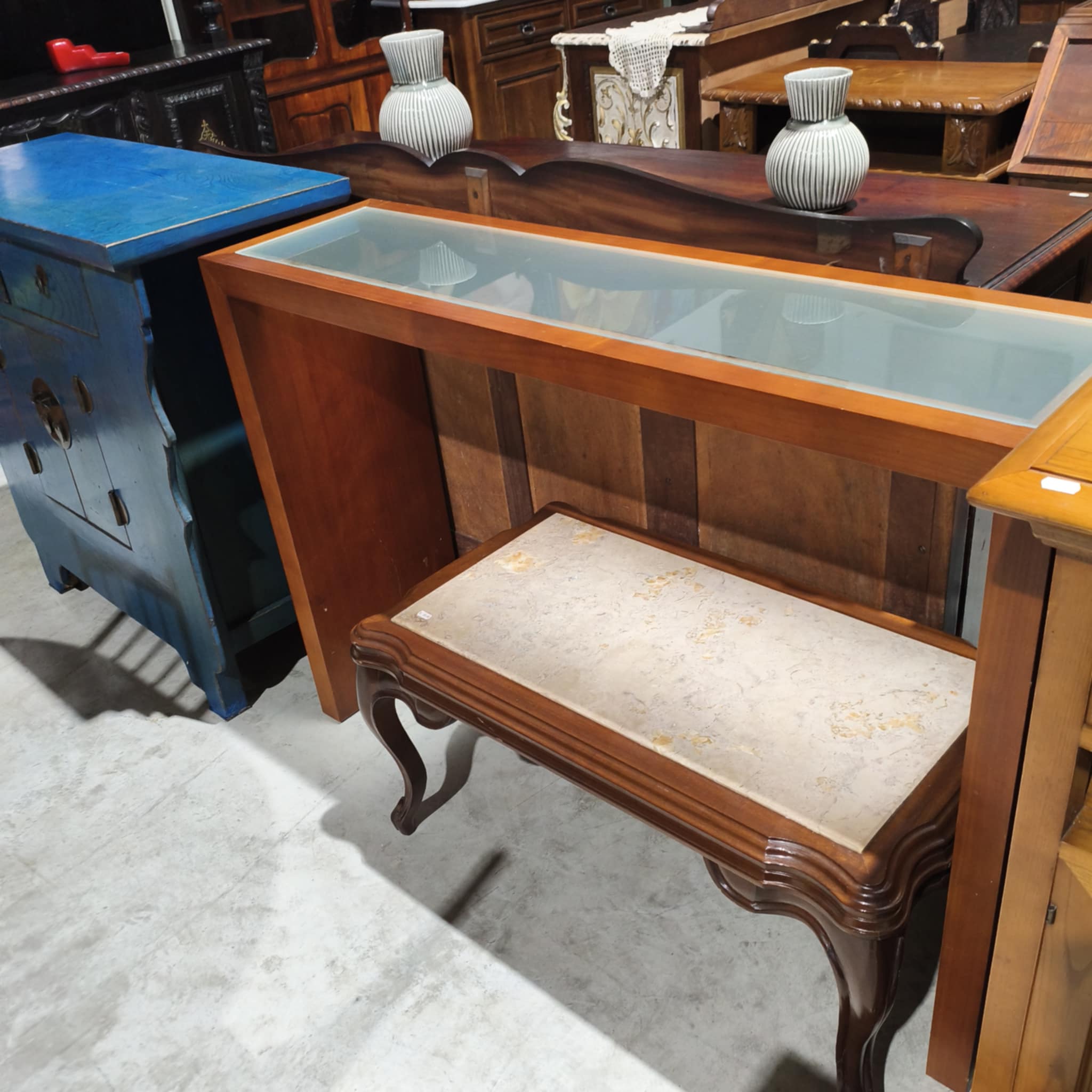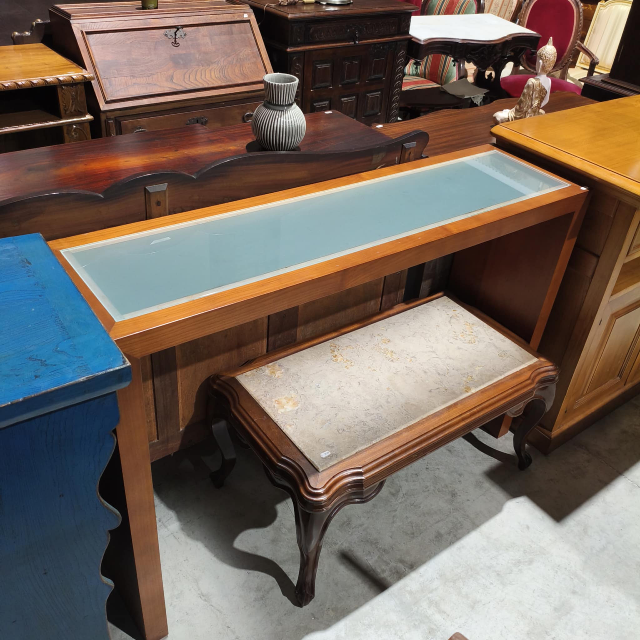 Consola em cerejeira com tampo de vidro.