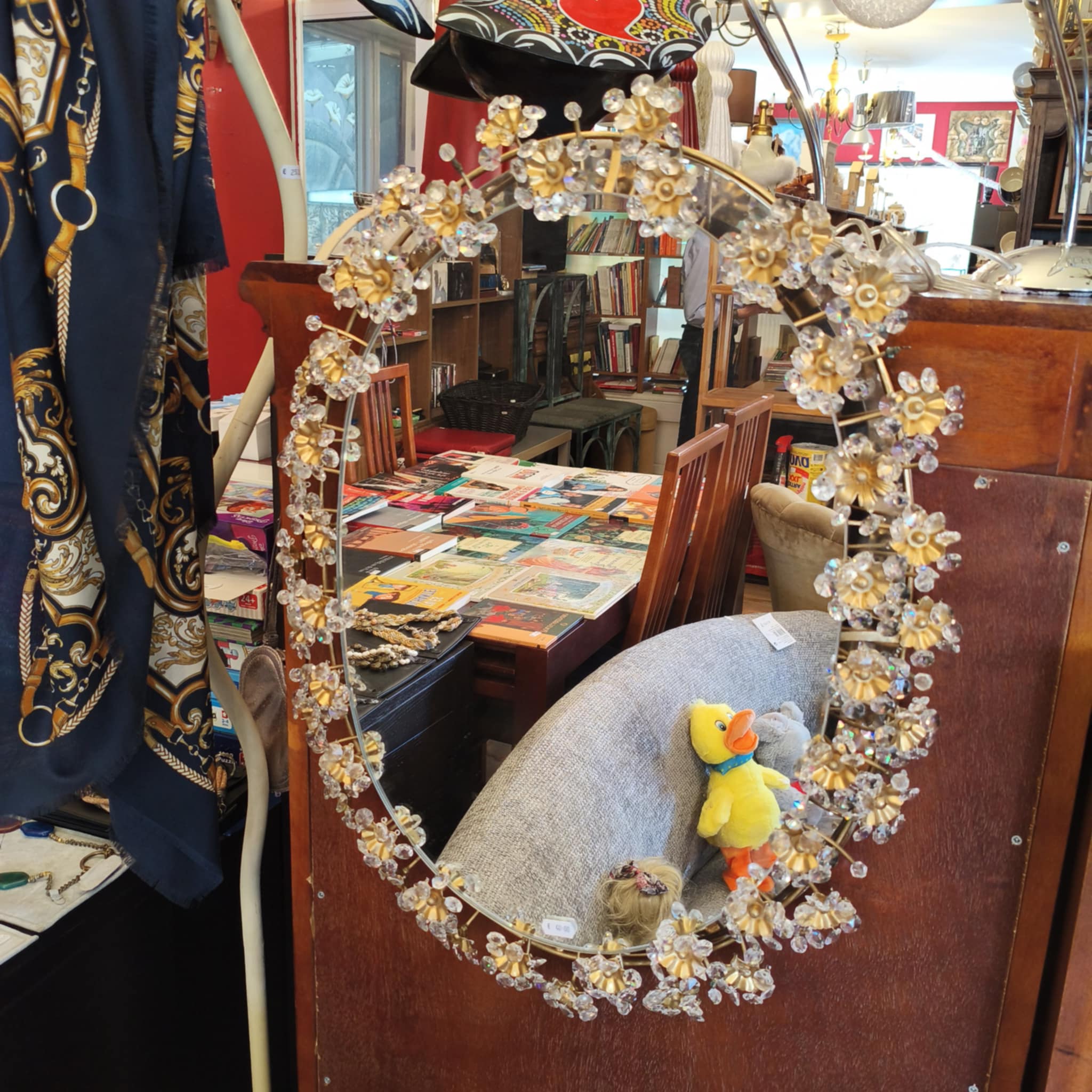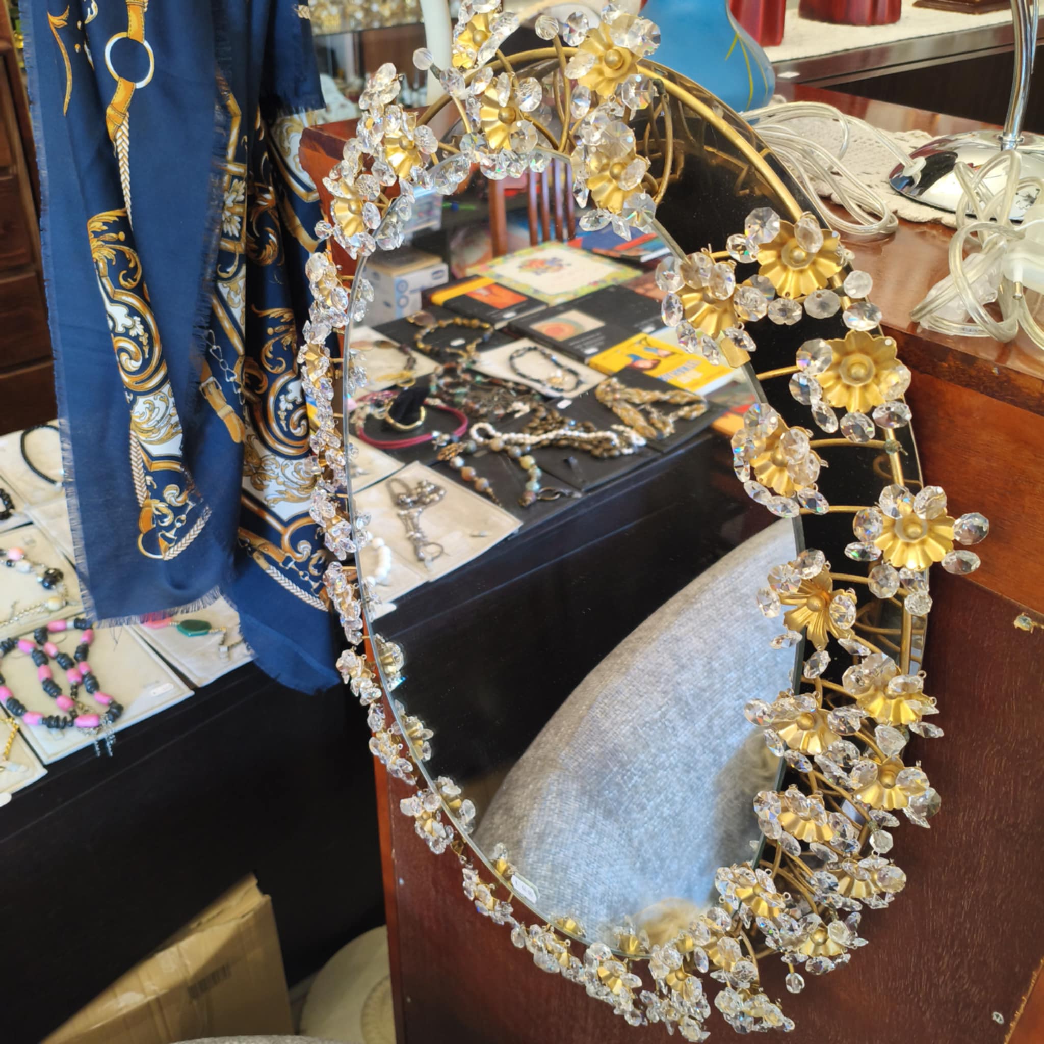 Espelho oval com decoração floral.