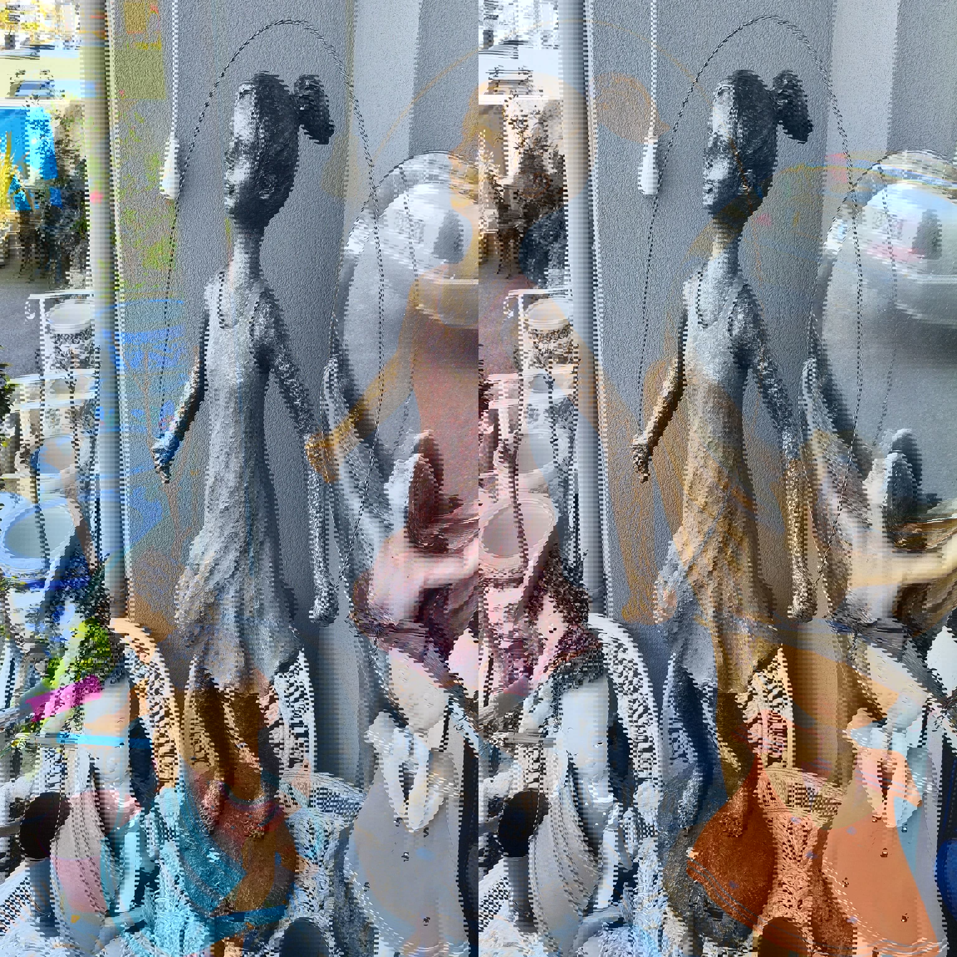 Estatueta de criança com corda, em poliresina.