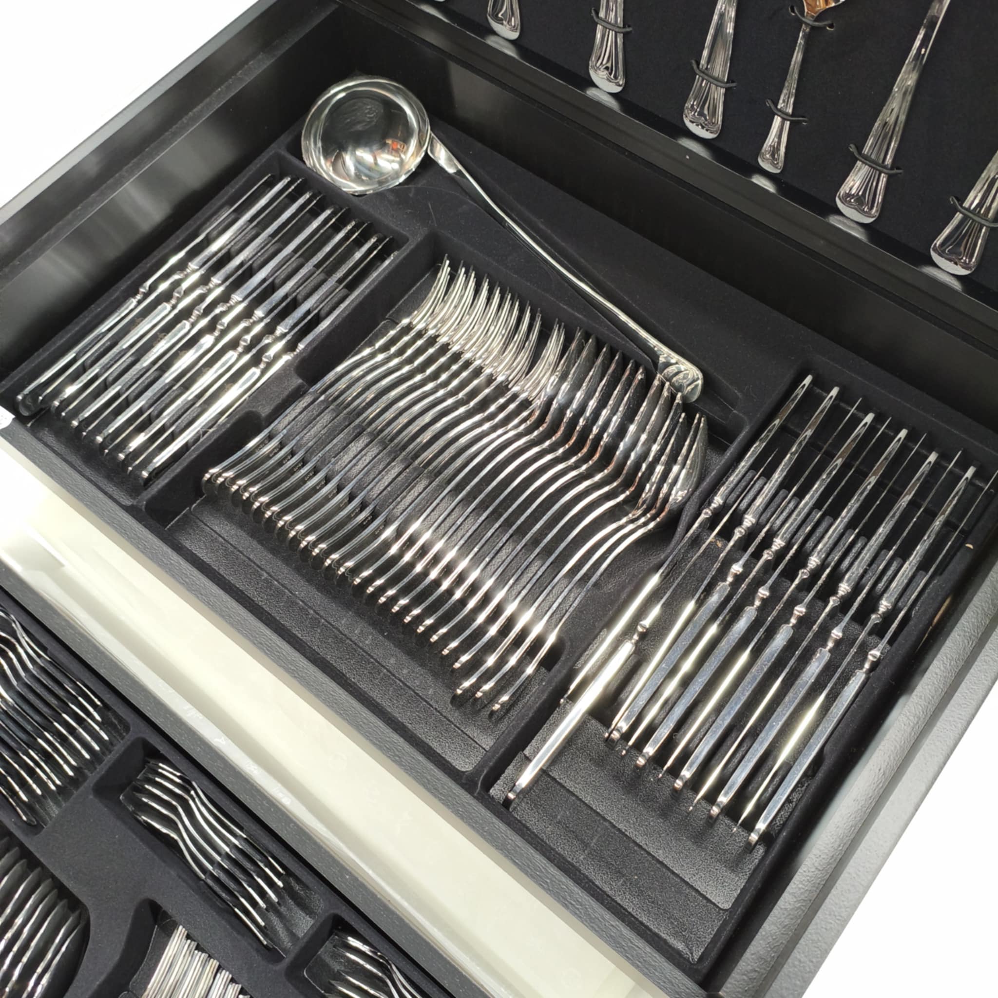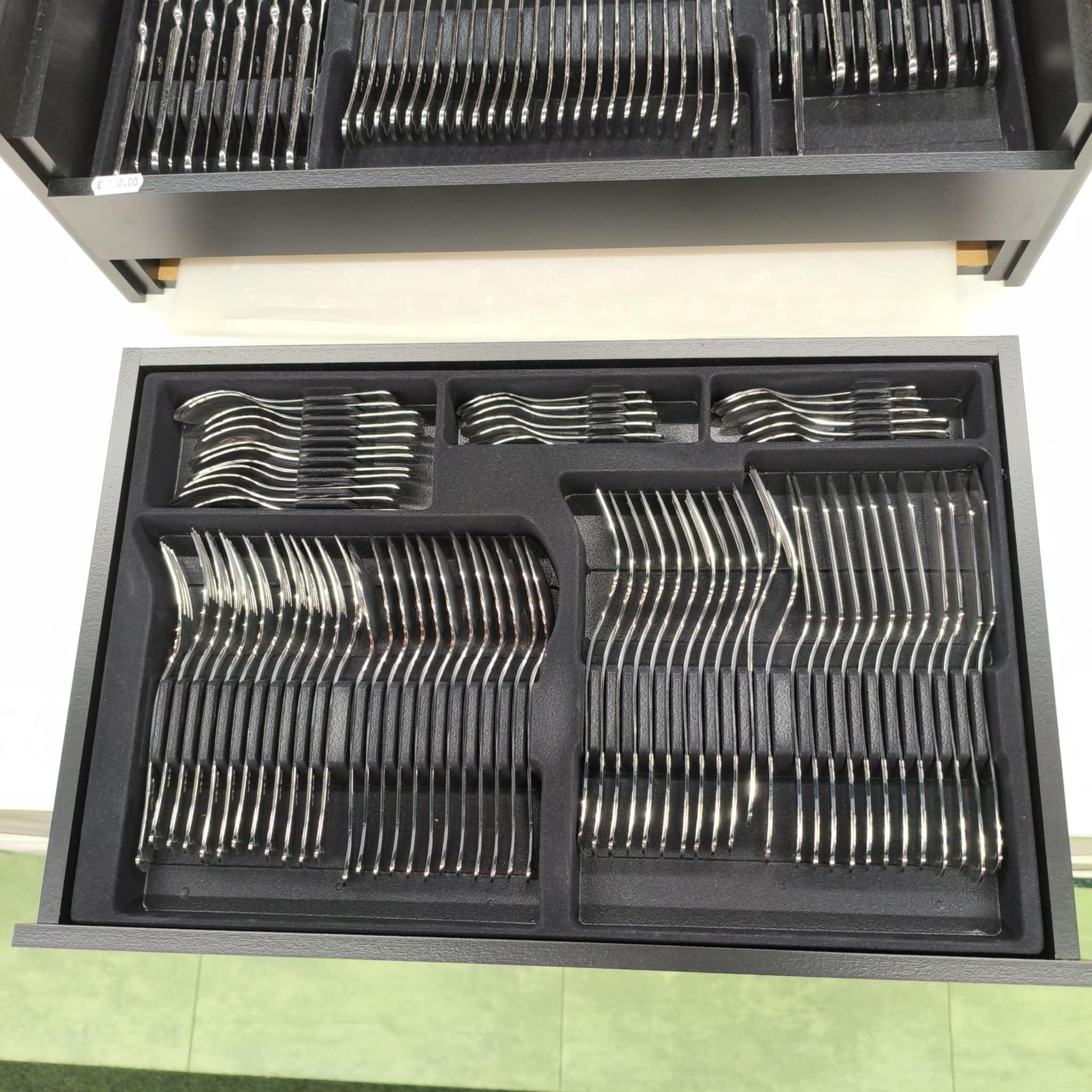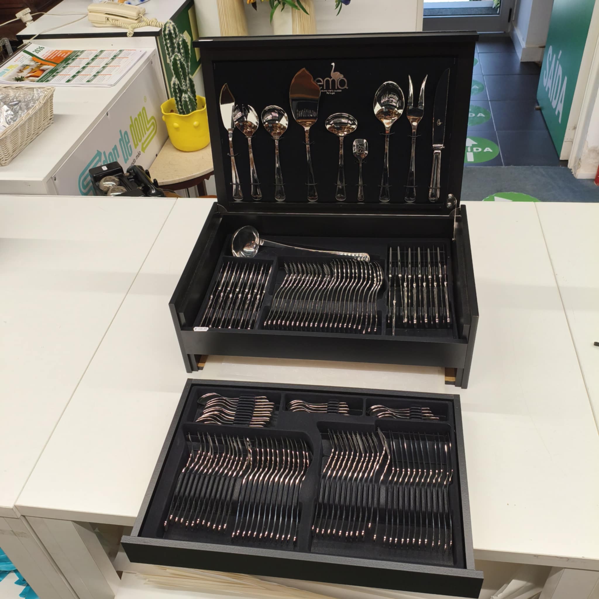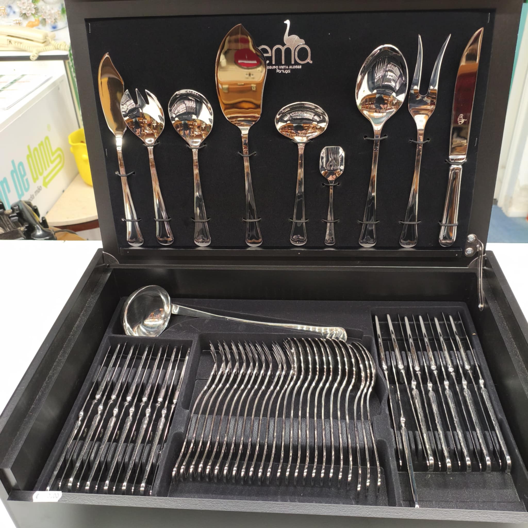 Faqueiro da marca EMA, grupo Vista Alegre. 12x Facas Carne 12x Facas Peixe 12x Garfos Carne 12x Garfos Peixe 12x Colheres Sopa 12x Colheres Sobremesa 12x Colheres Chá 12x Colheres Café 1x Faca Manteiga / Queijo 1x Colher Servir 1x Colher Molho 1x Pá Bolo 1x Concha Sopa 1x Colher Açúcar 1x Colher Arroz 1x Garfo ServiR carne 1x Faca Servir Carne