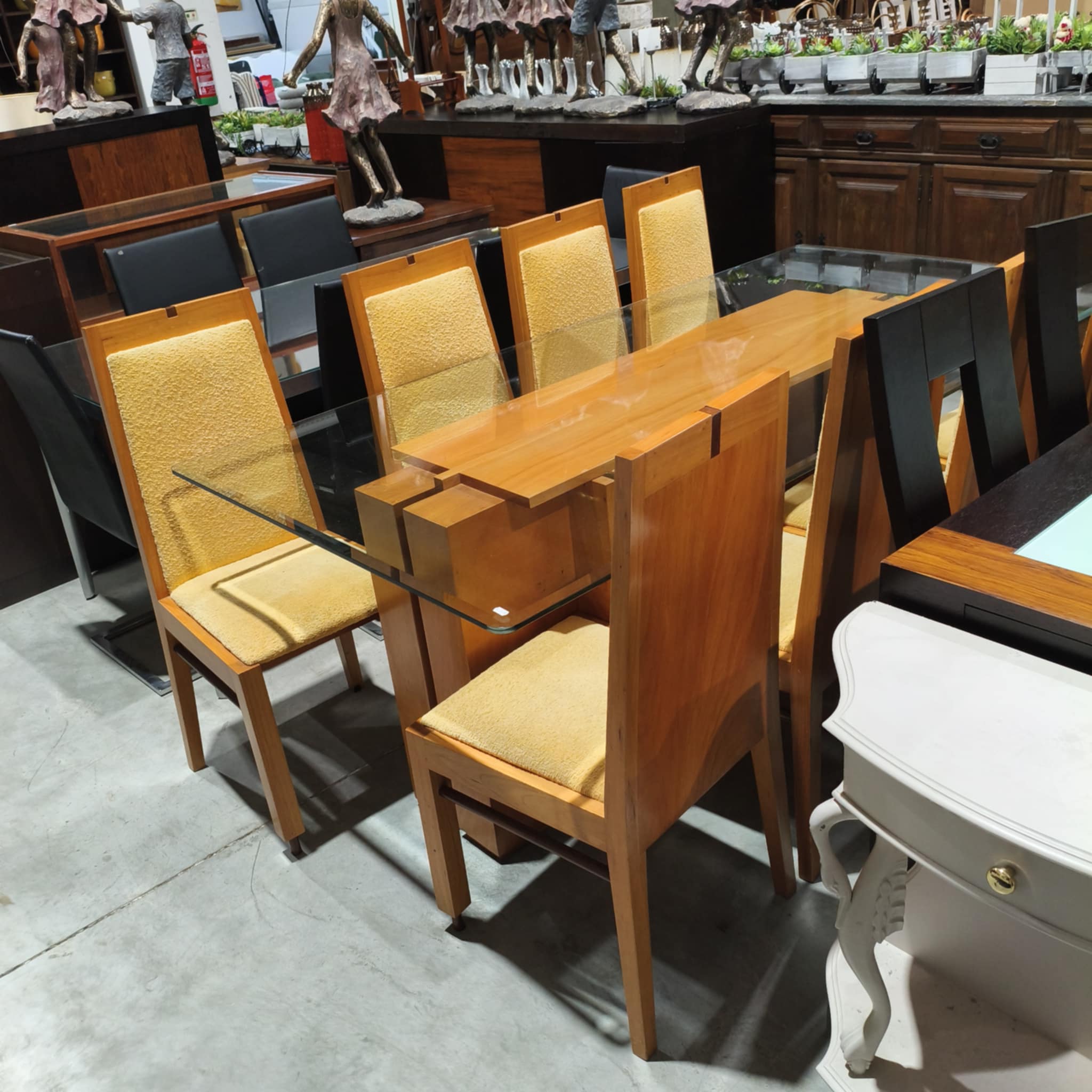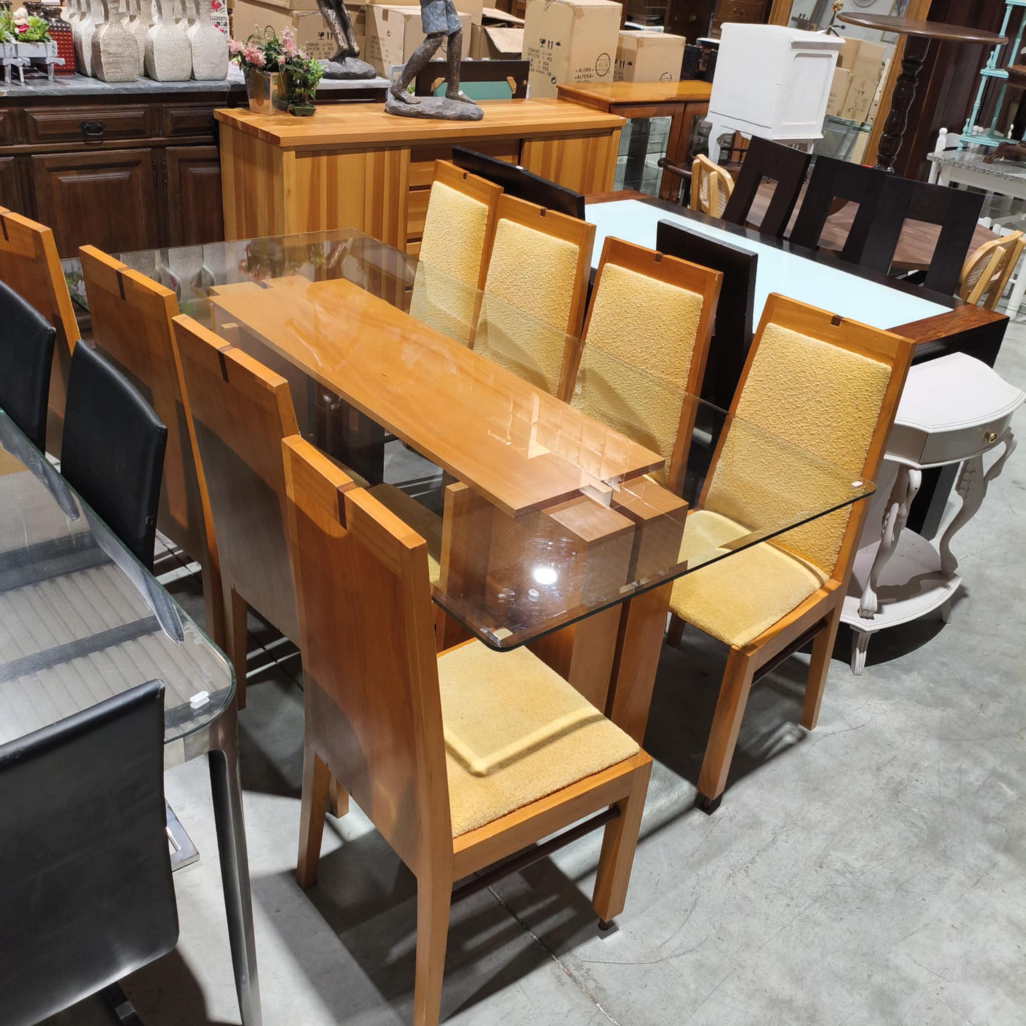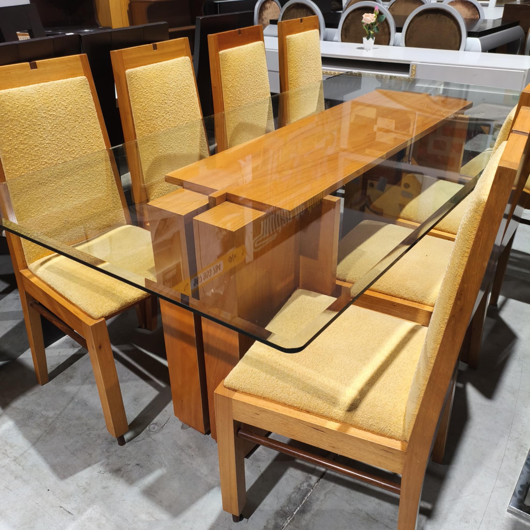 Mesa em cerejeira com tampo de vidro, 8 cadeiras incluídas.