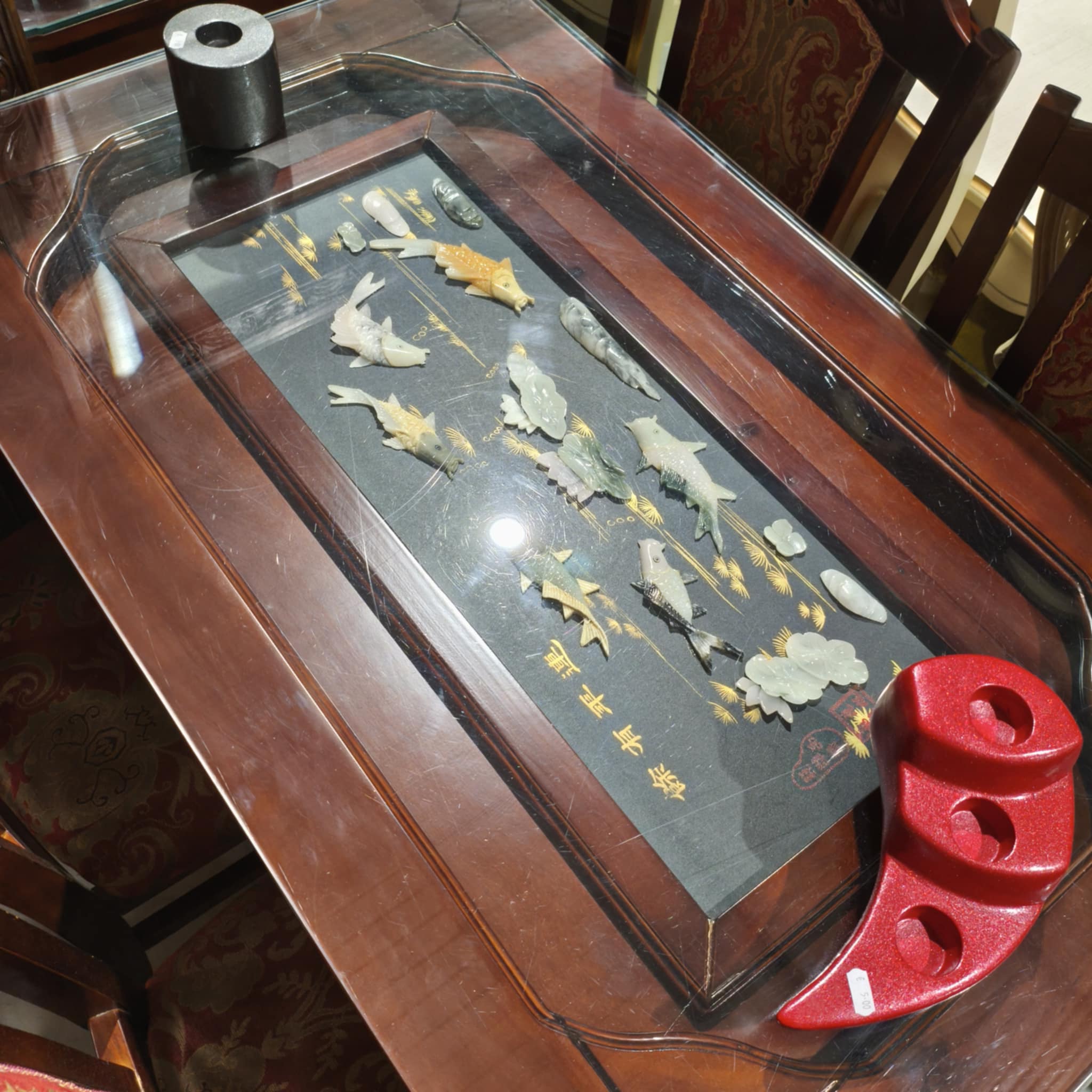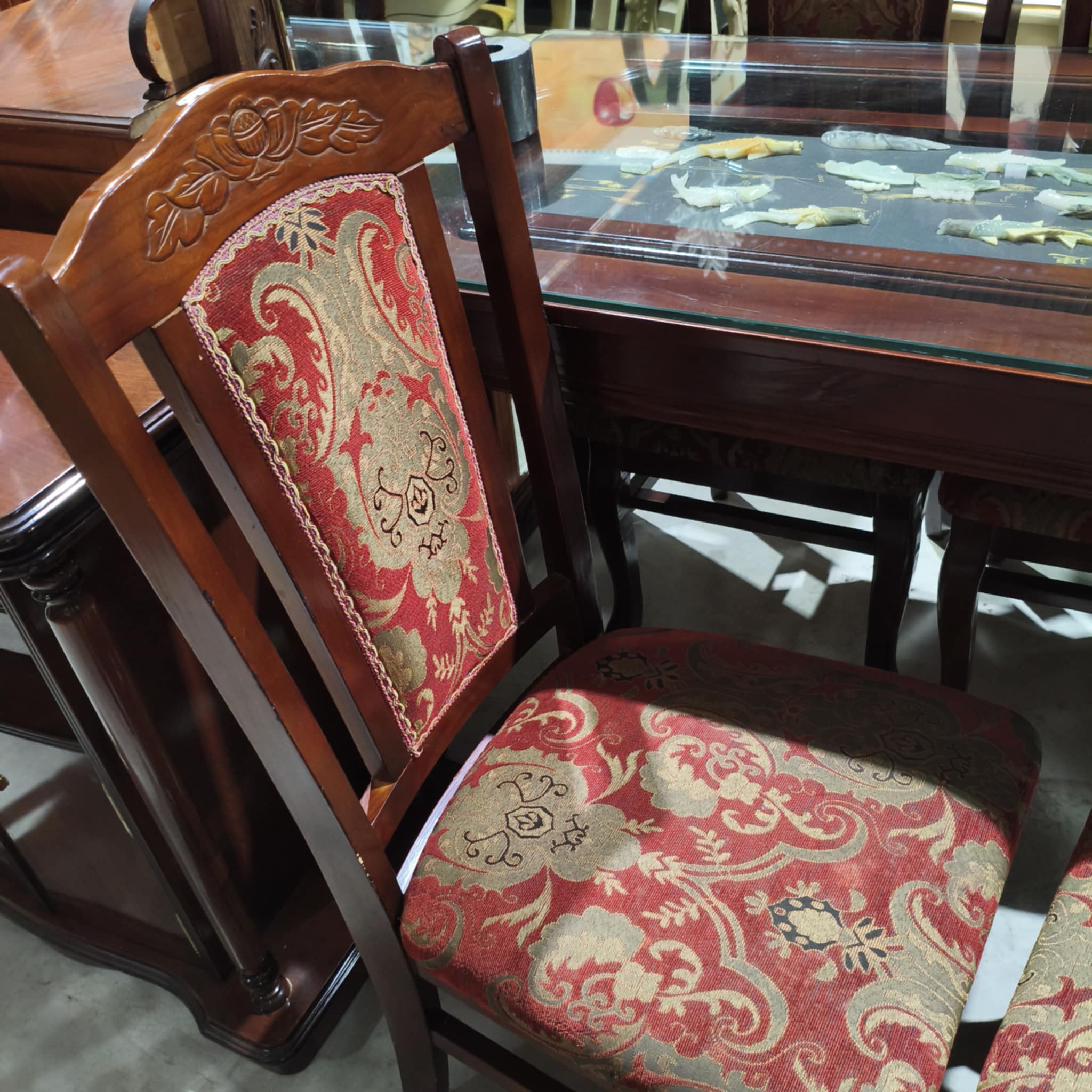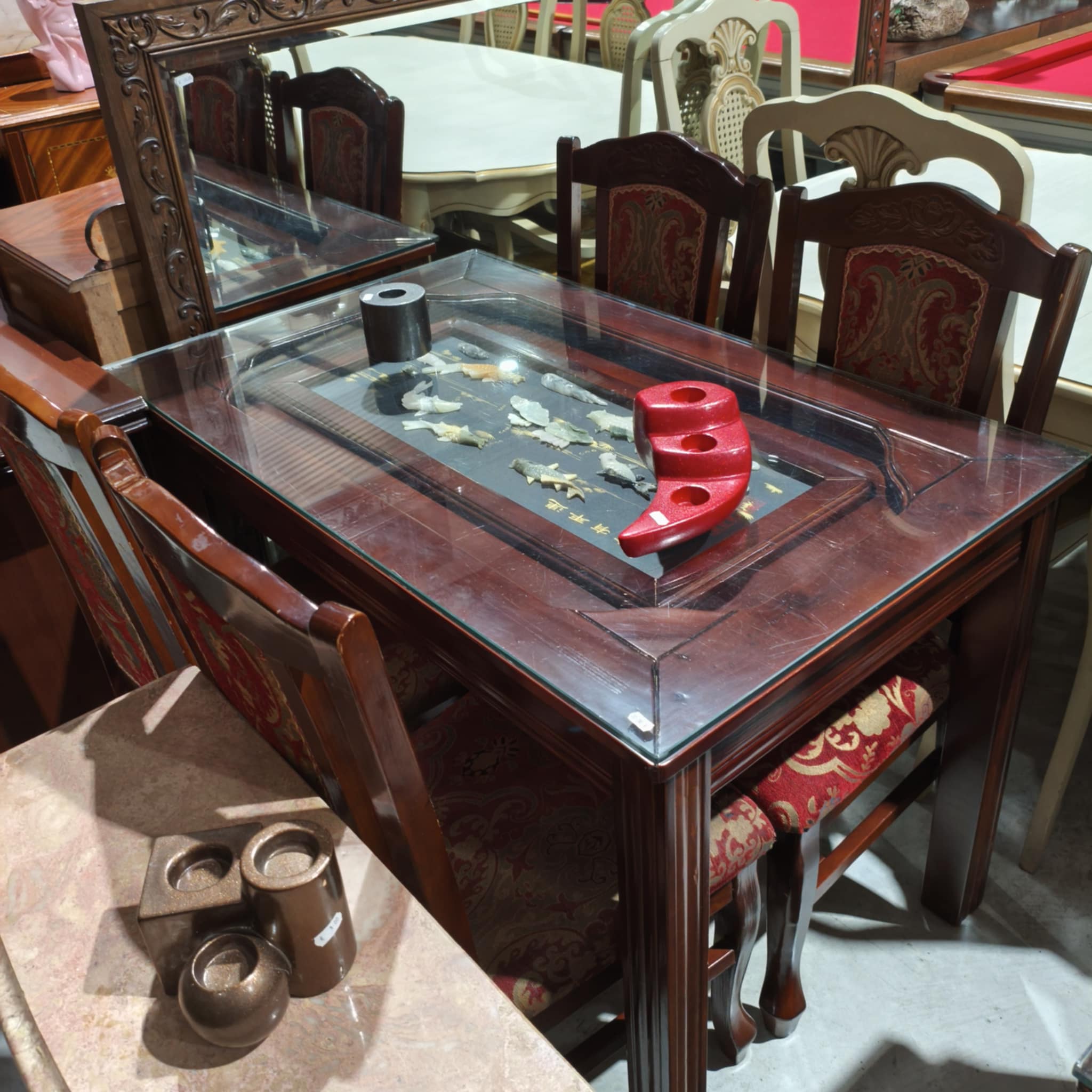 Mesa estilo chinês, com tampo de vidro, 4 cadeiras incluídas.