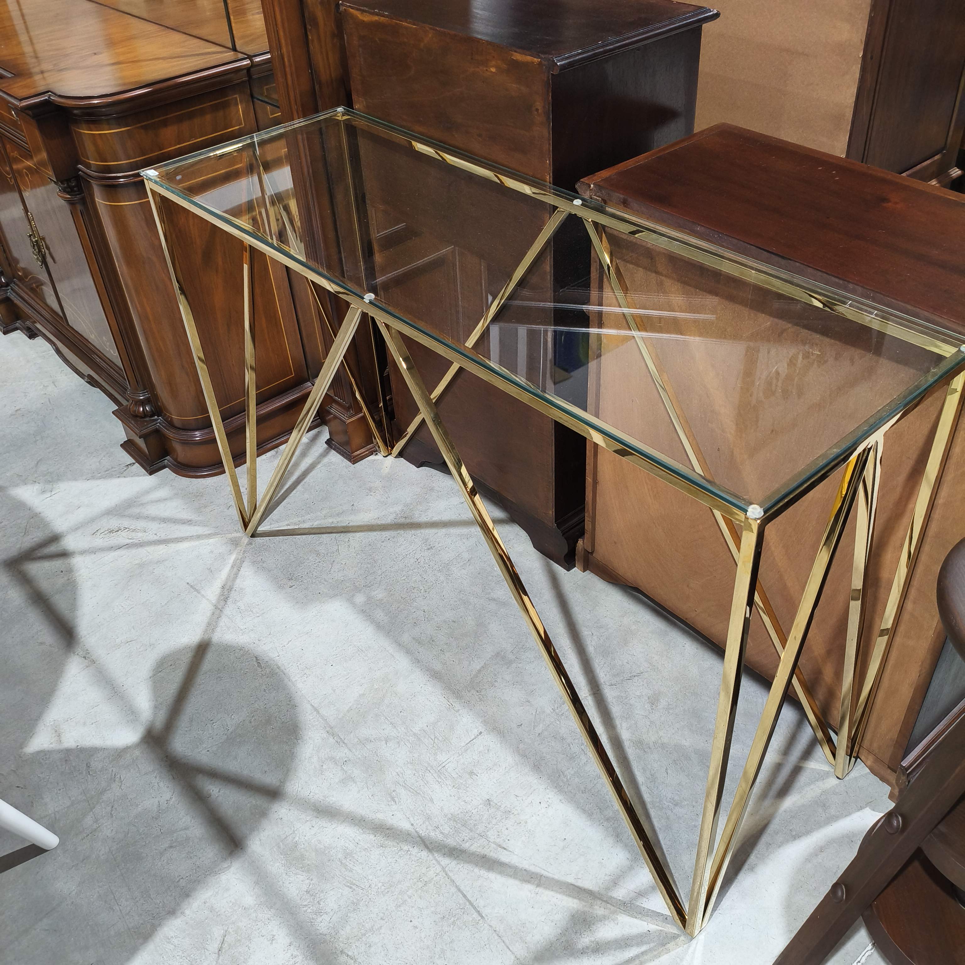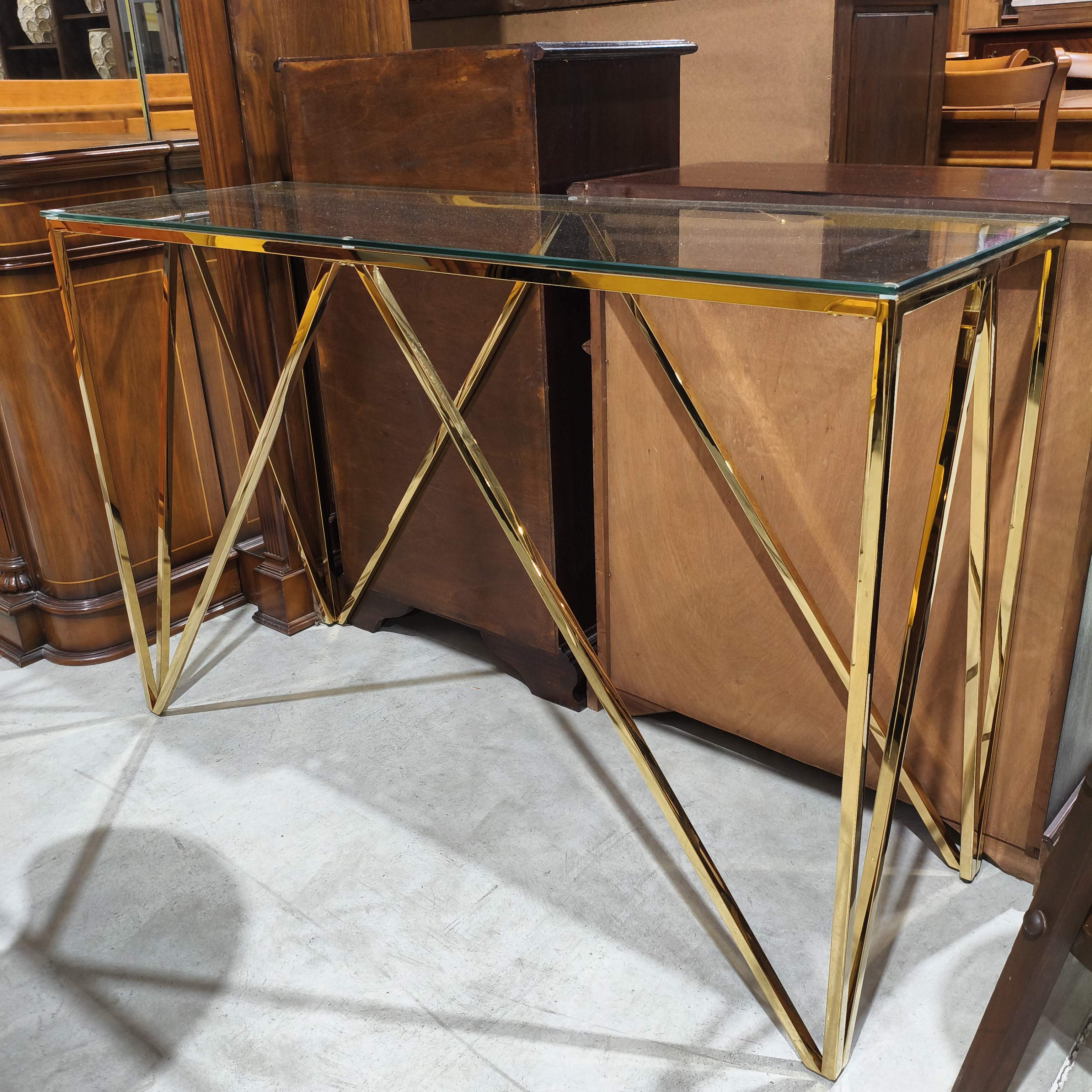 Mesa em estrutura de ferro, dourado, e com tampo de vidro.