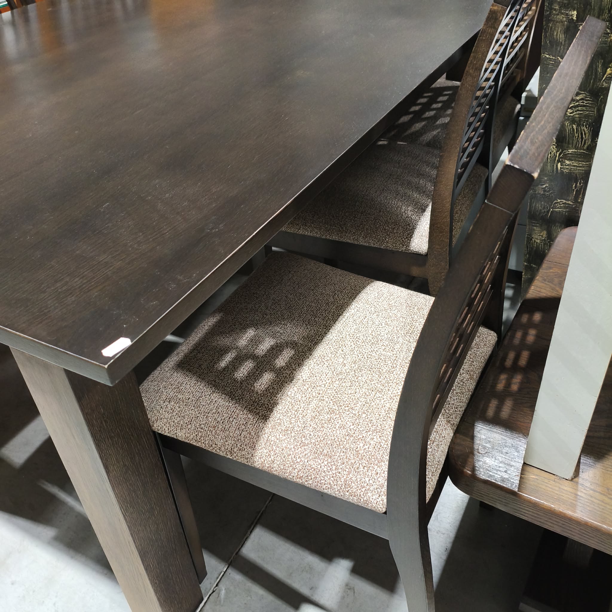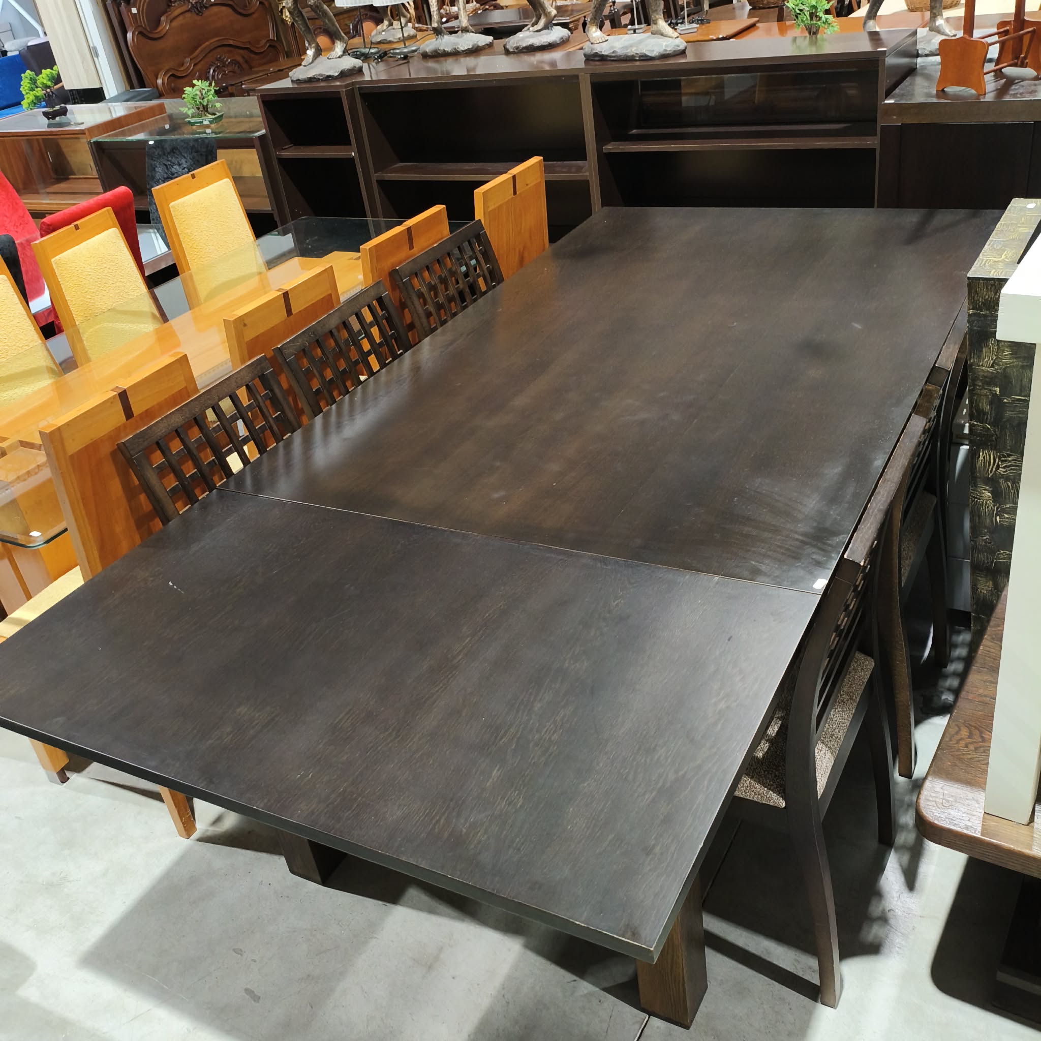 Mesa extensível em wengue, com 6 cadeiras incluídas.