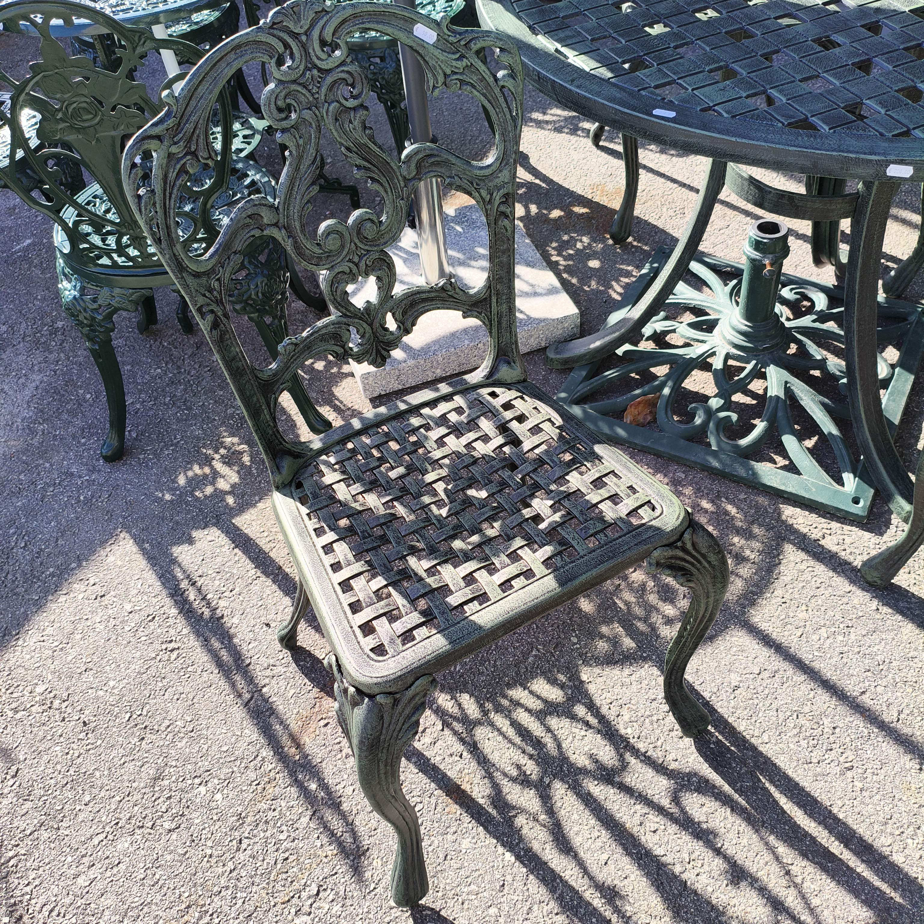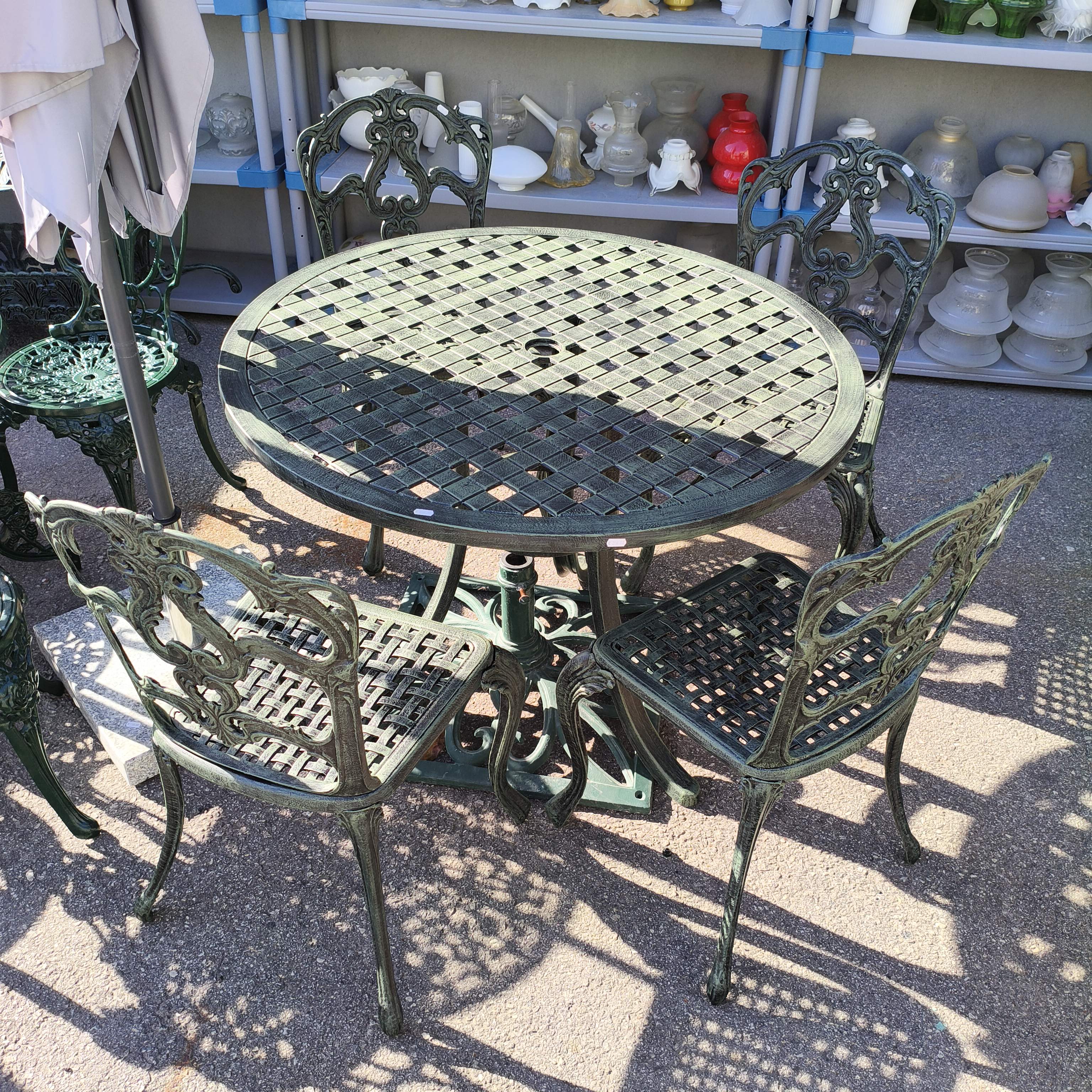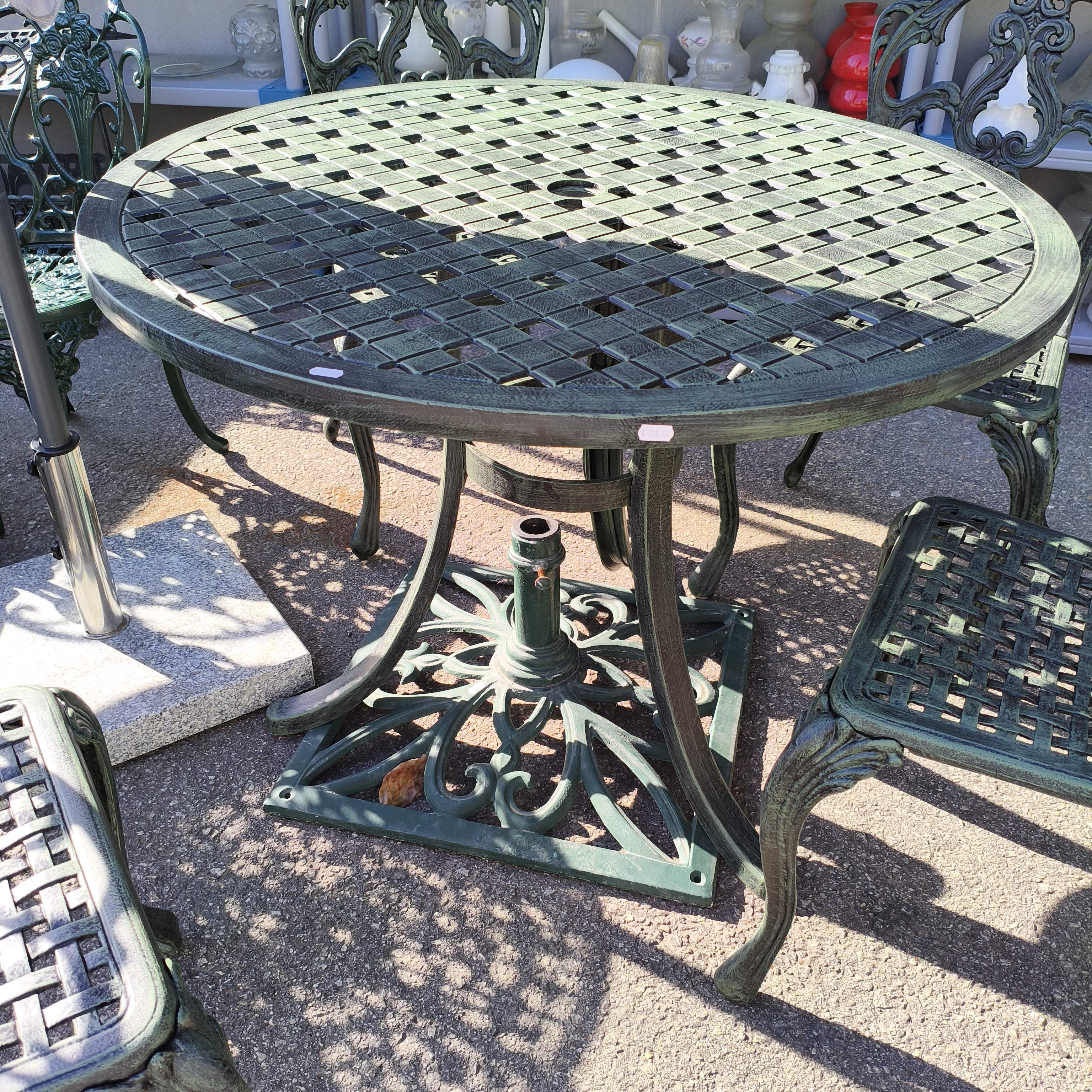 Mesa exterior em alumínio, com 4 cadeiras incluídas, cor verde escuro.