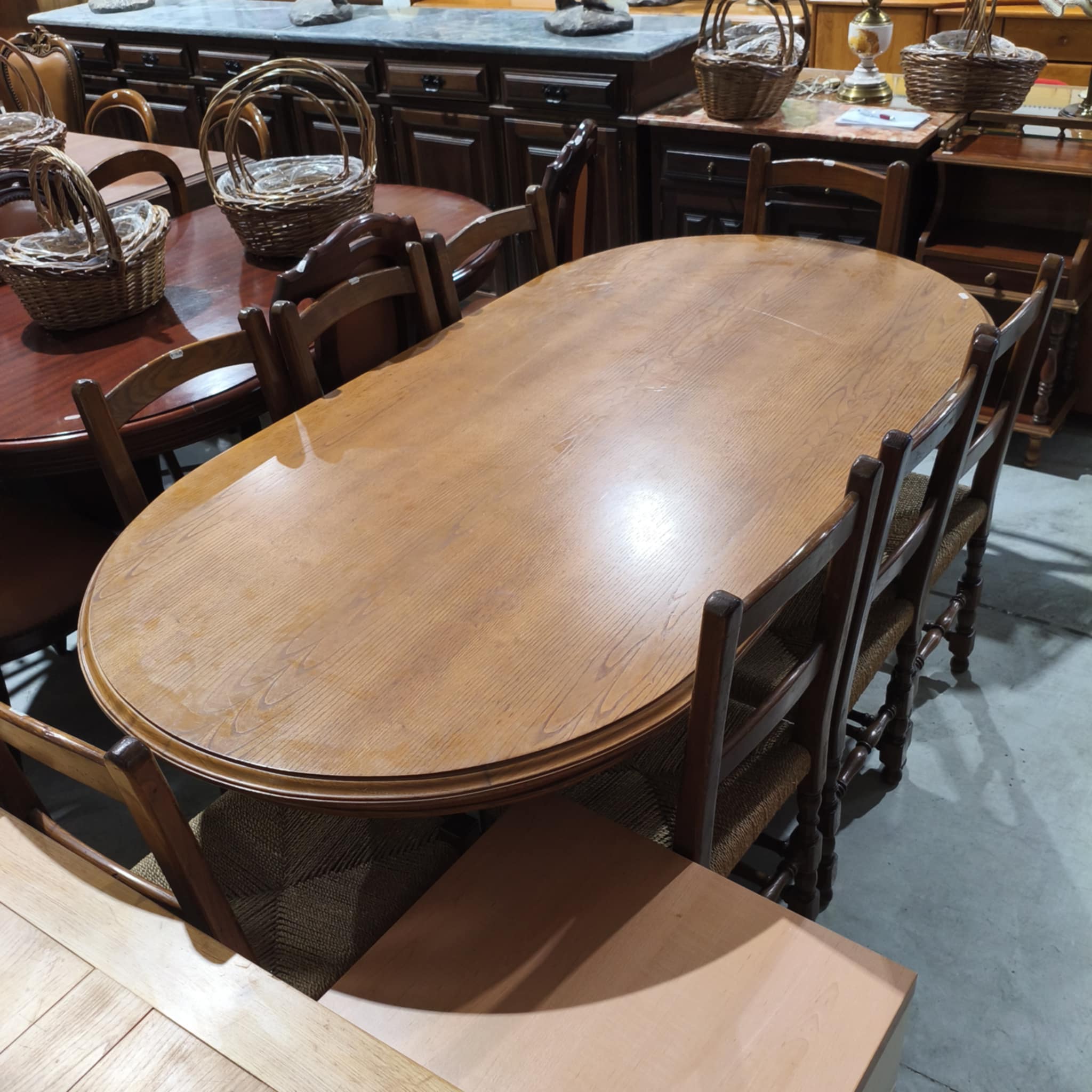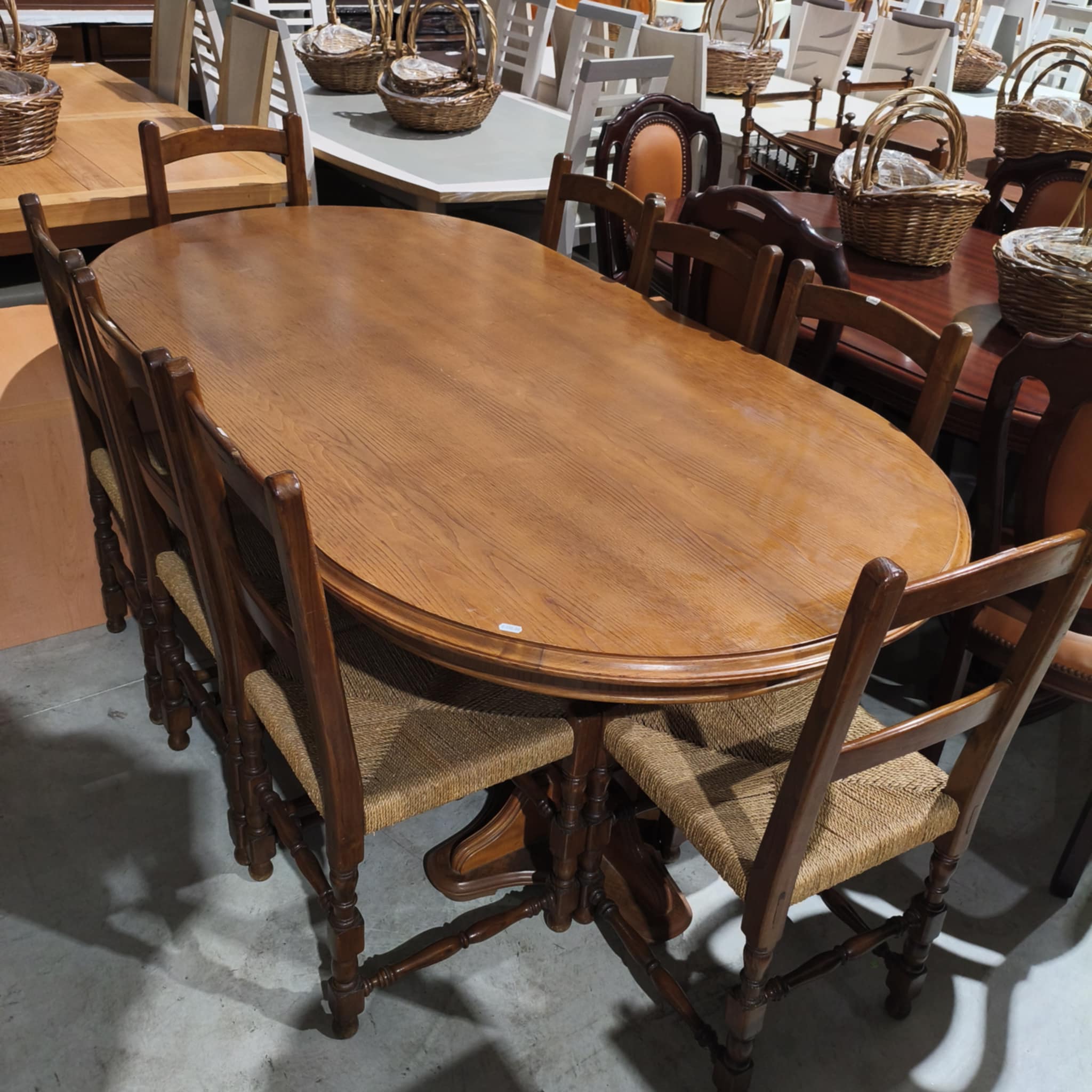 Mesa oval, em castanho, cor mel. Cadeiras não incluídas.