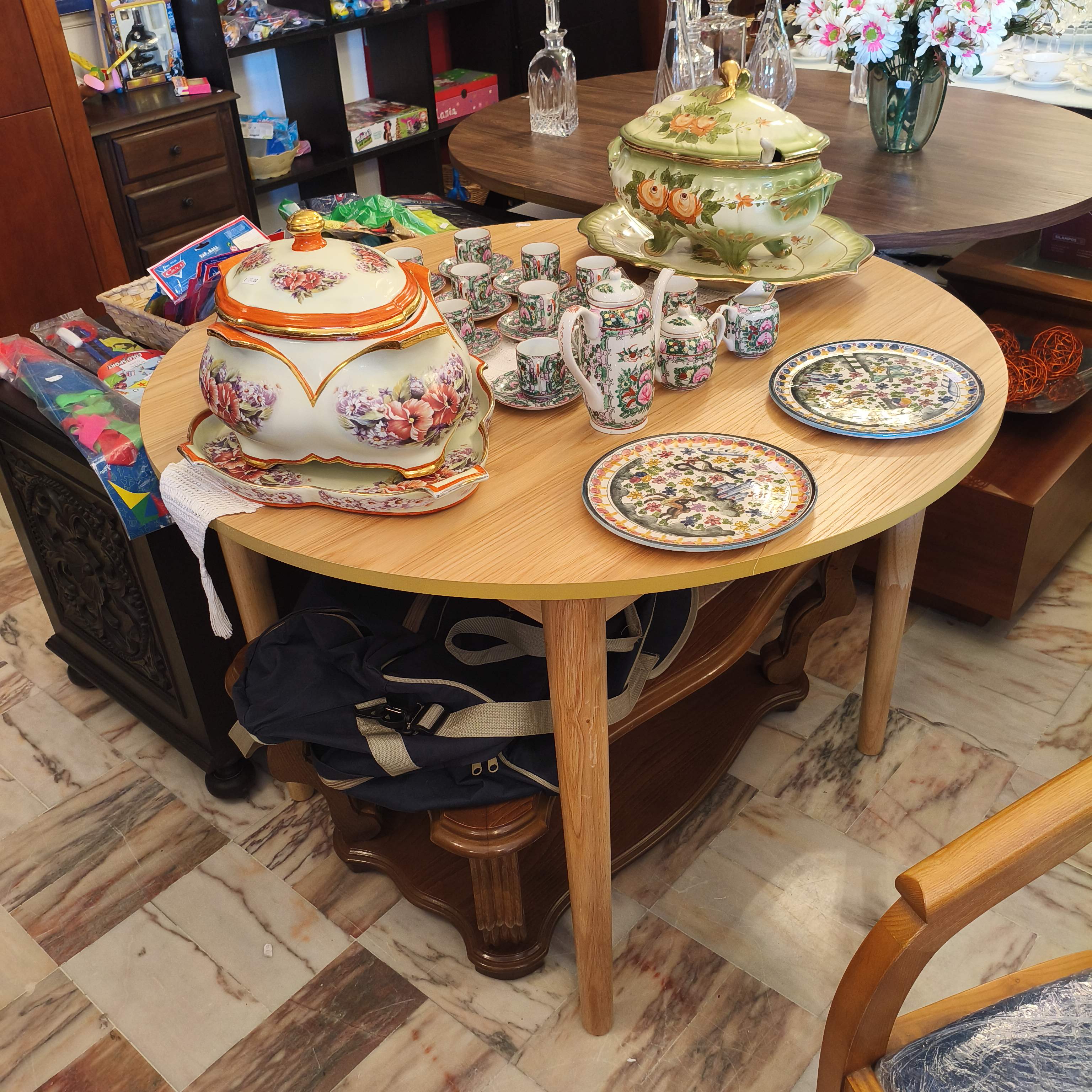 Mesa redonda em pinho mel.