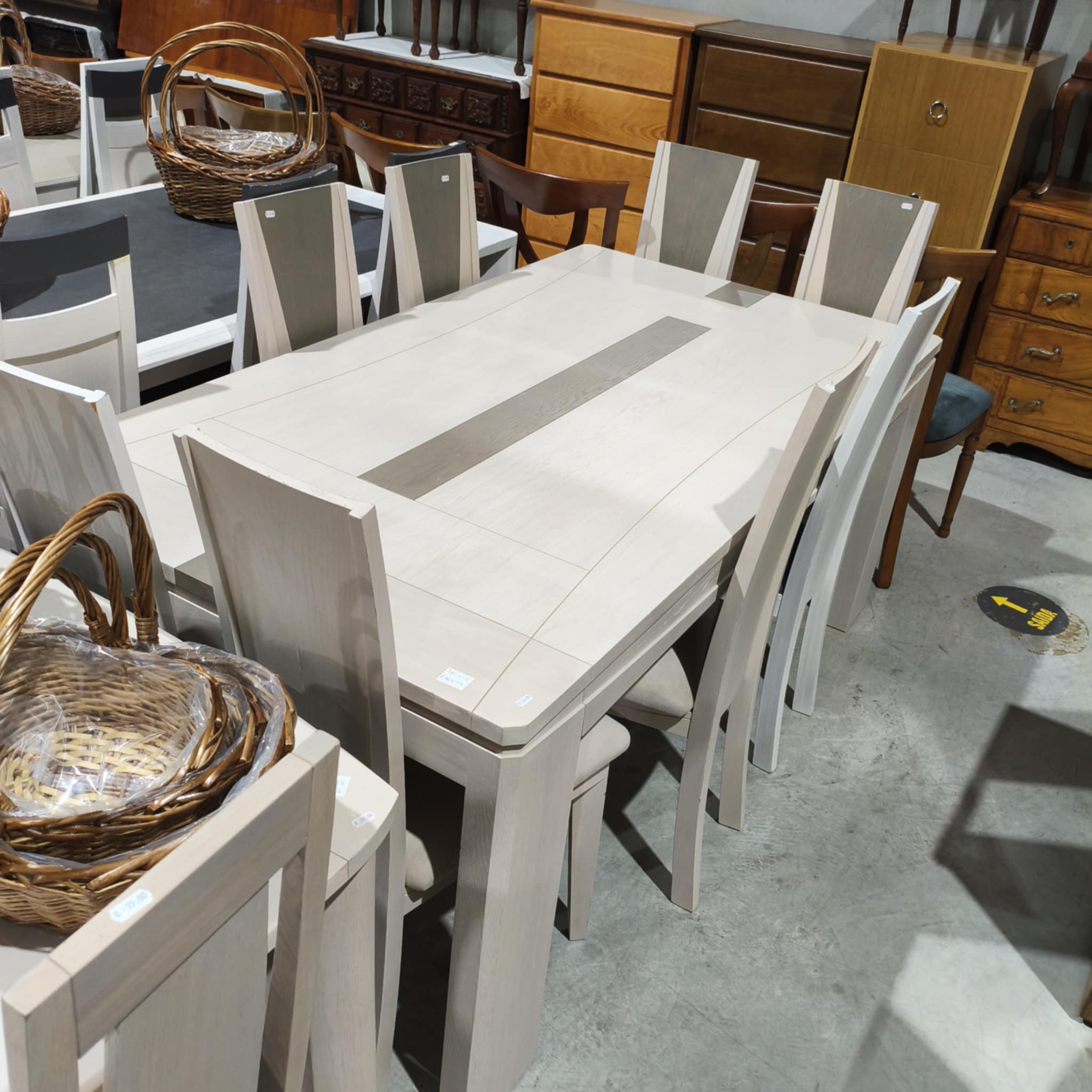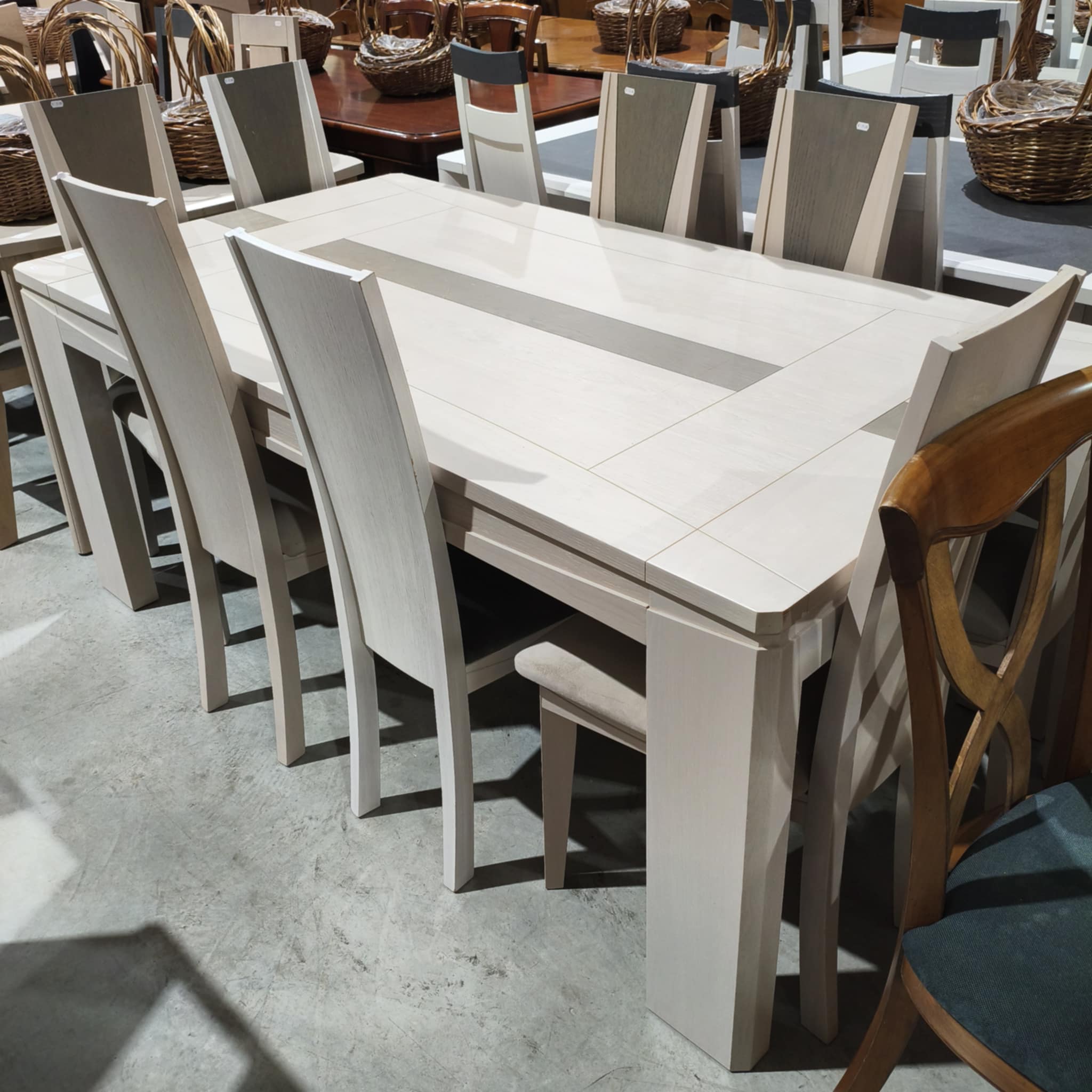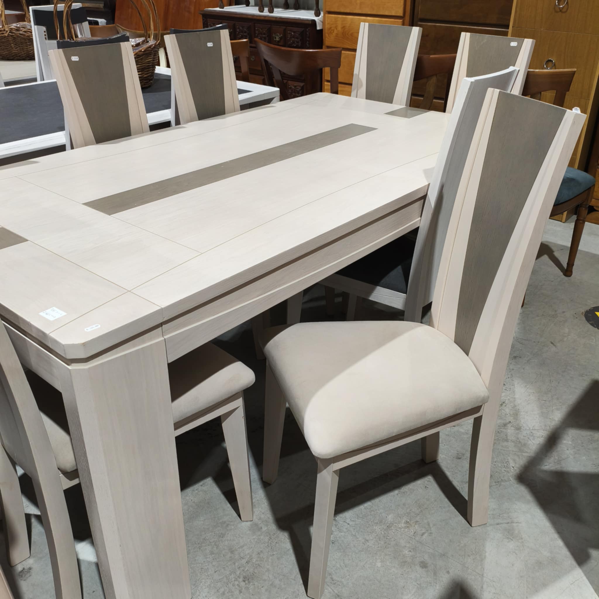 Mesa estilo wengue bege, extensível, com 6 cadeiras incluídas.