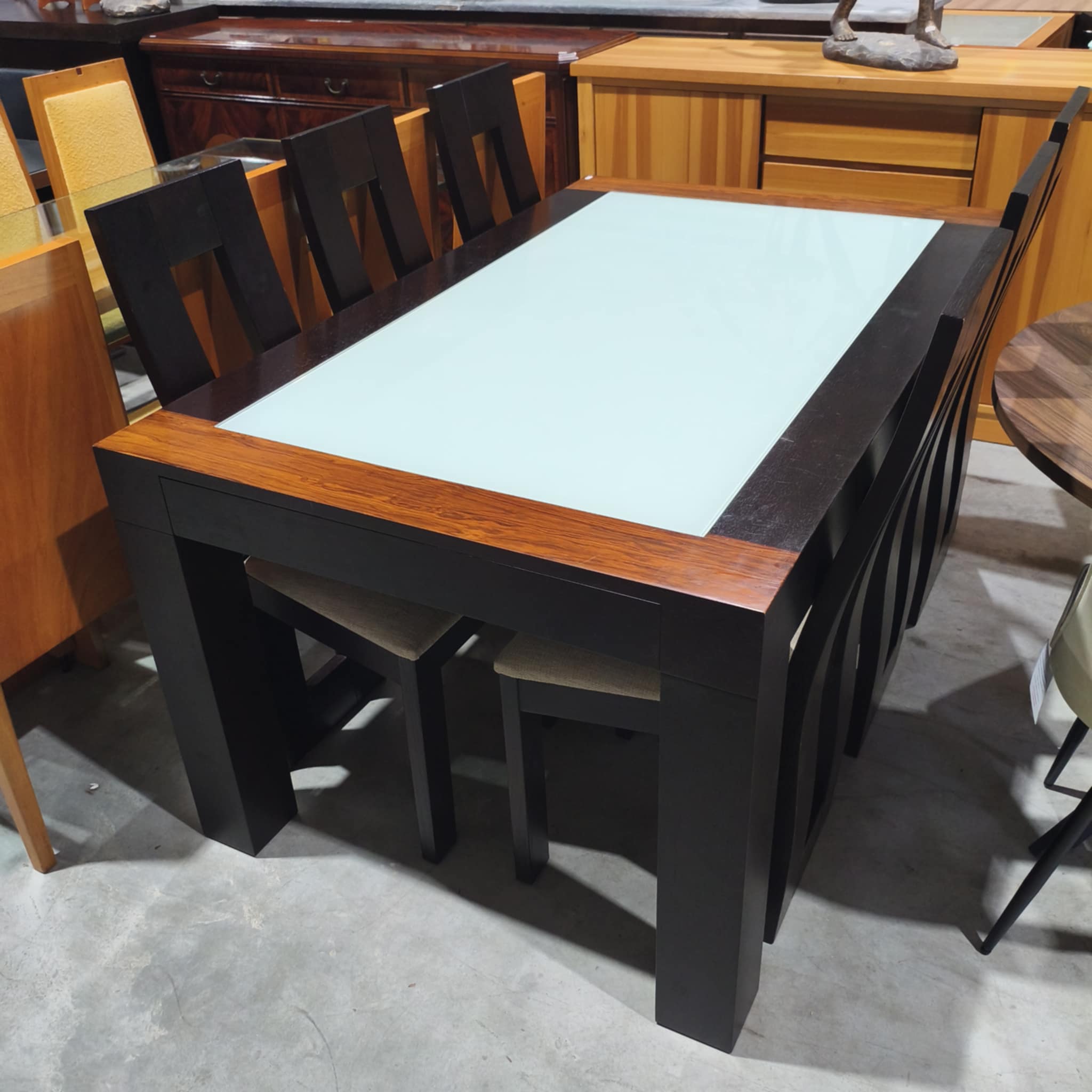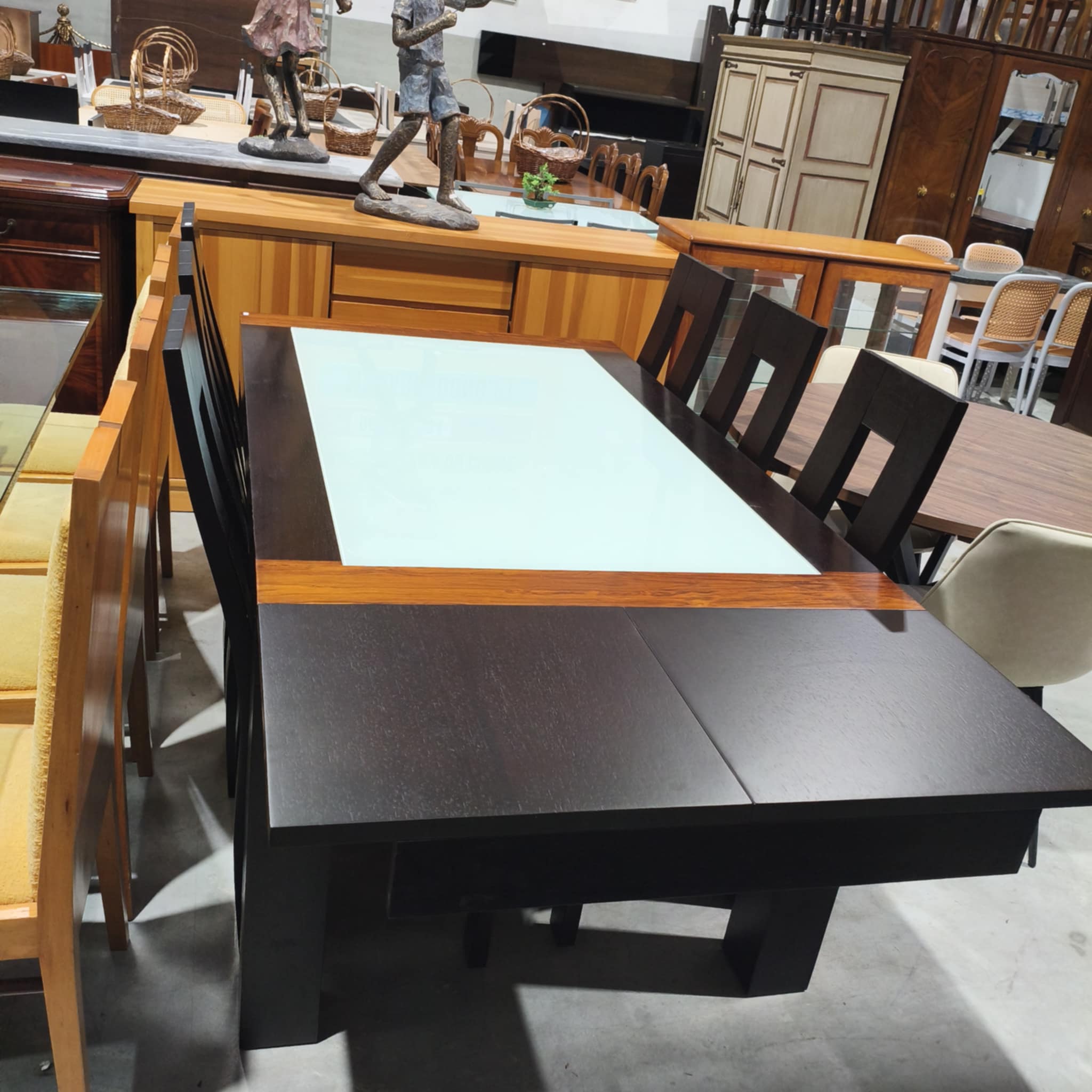 Mesa wengue extensível, com tampo de vidro, 6 cadeiras incluídas.