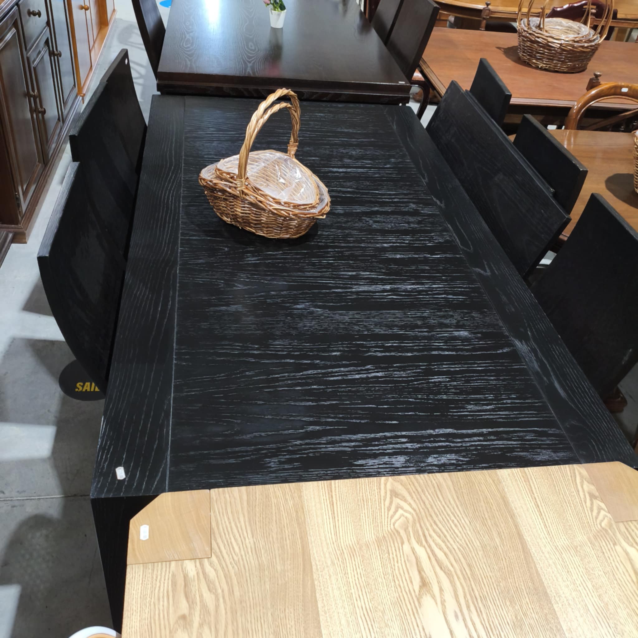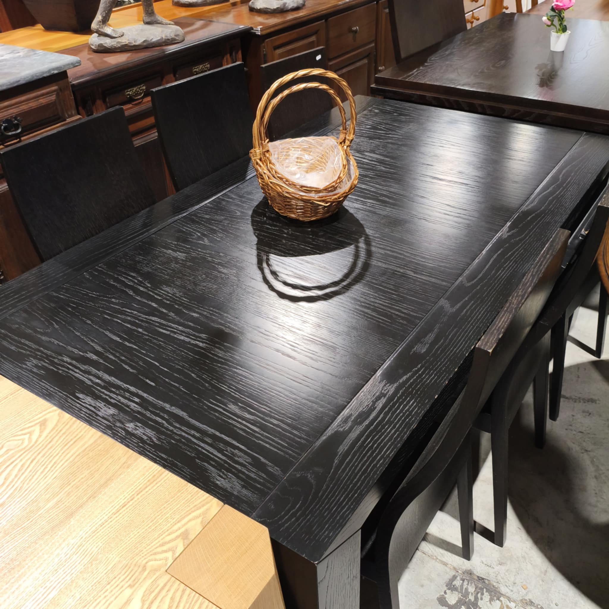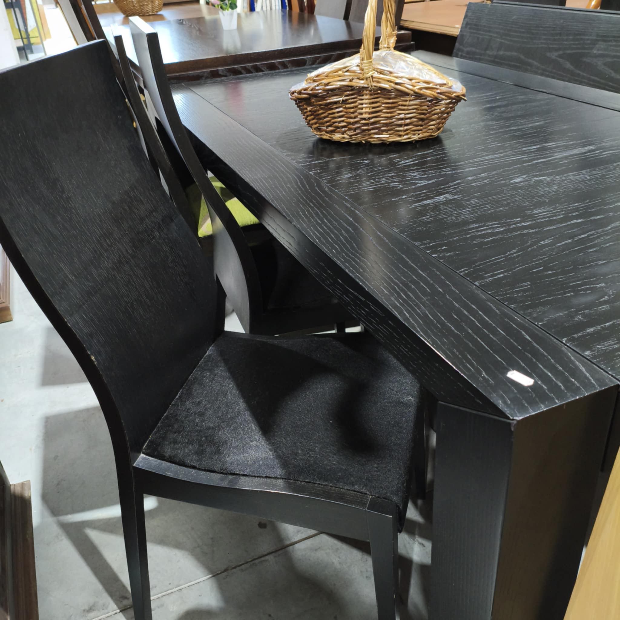 Mesa extensível em wengue preto, com 6 cadeiras incluídas.