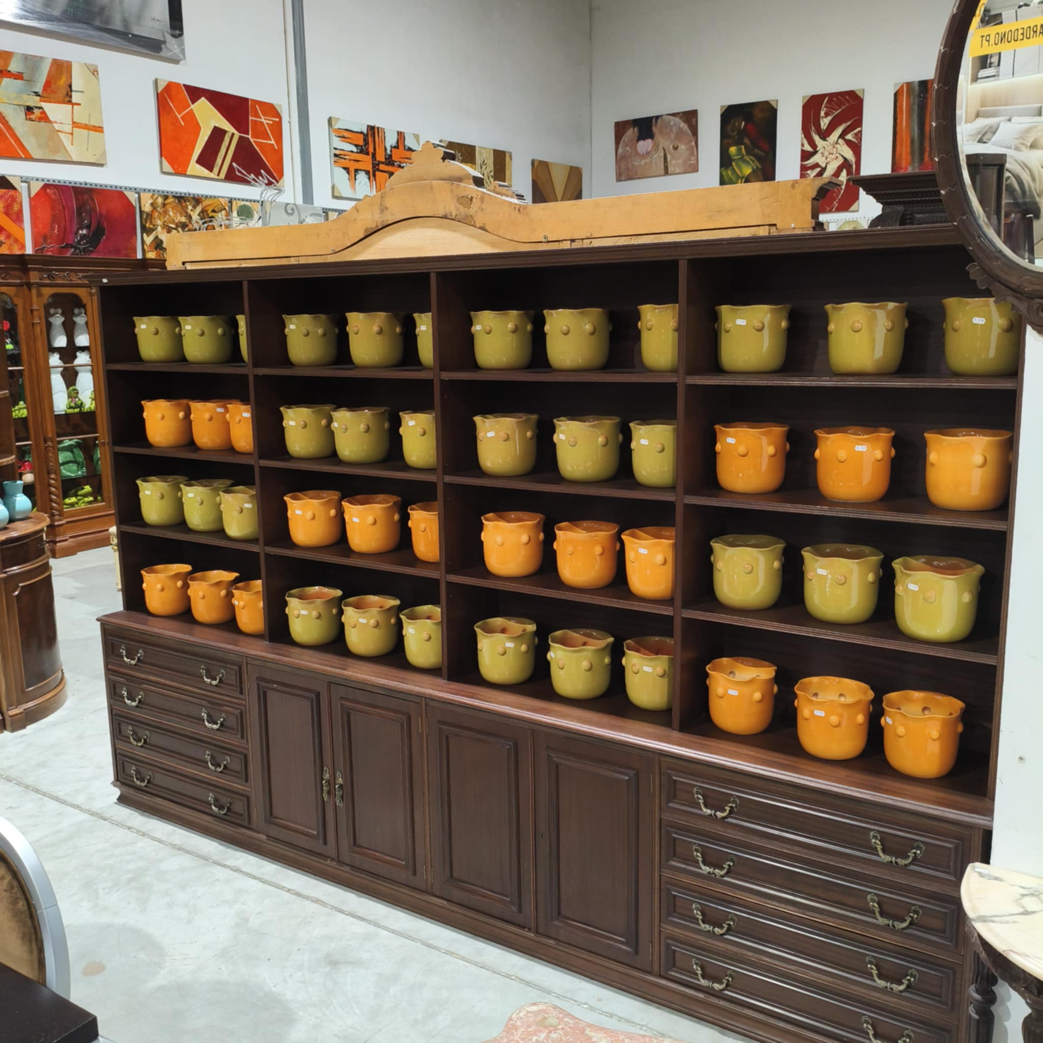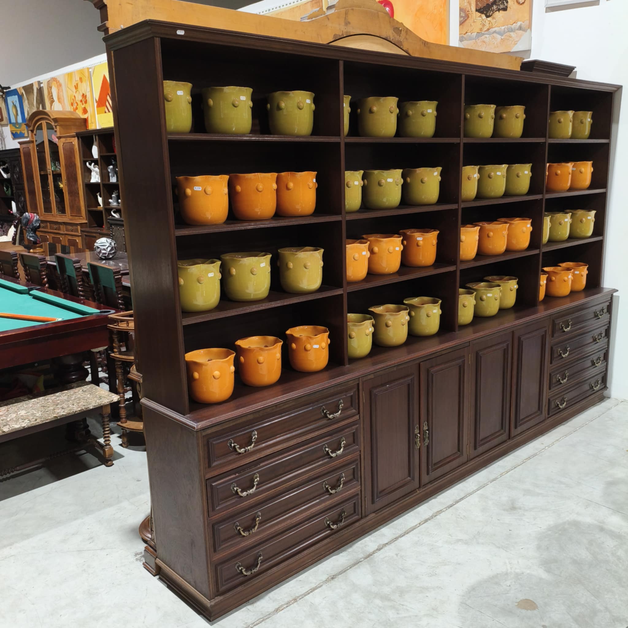 Móvel estante em castanho, com muita arrumação.