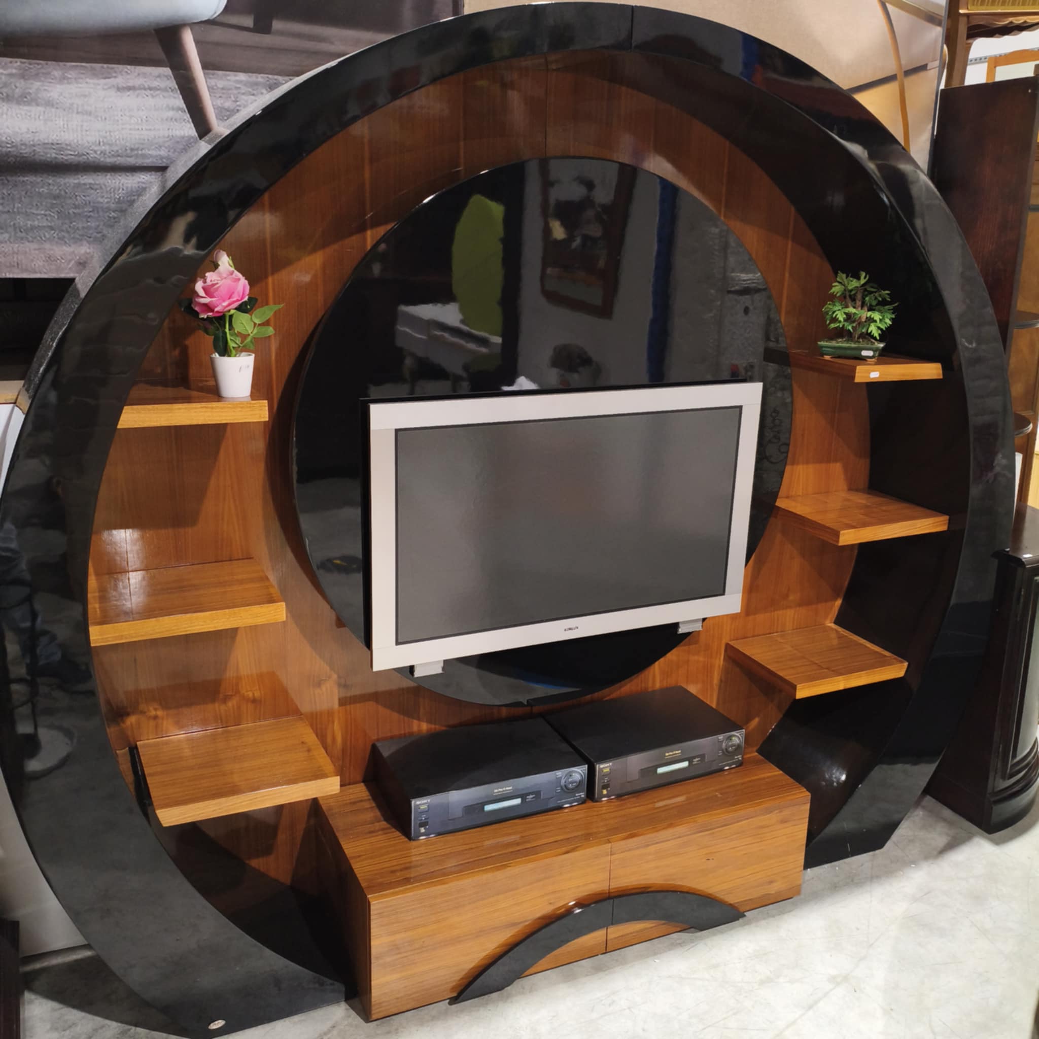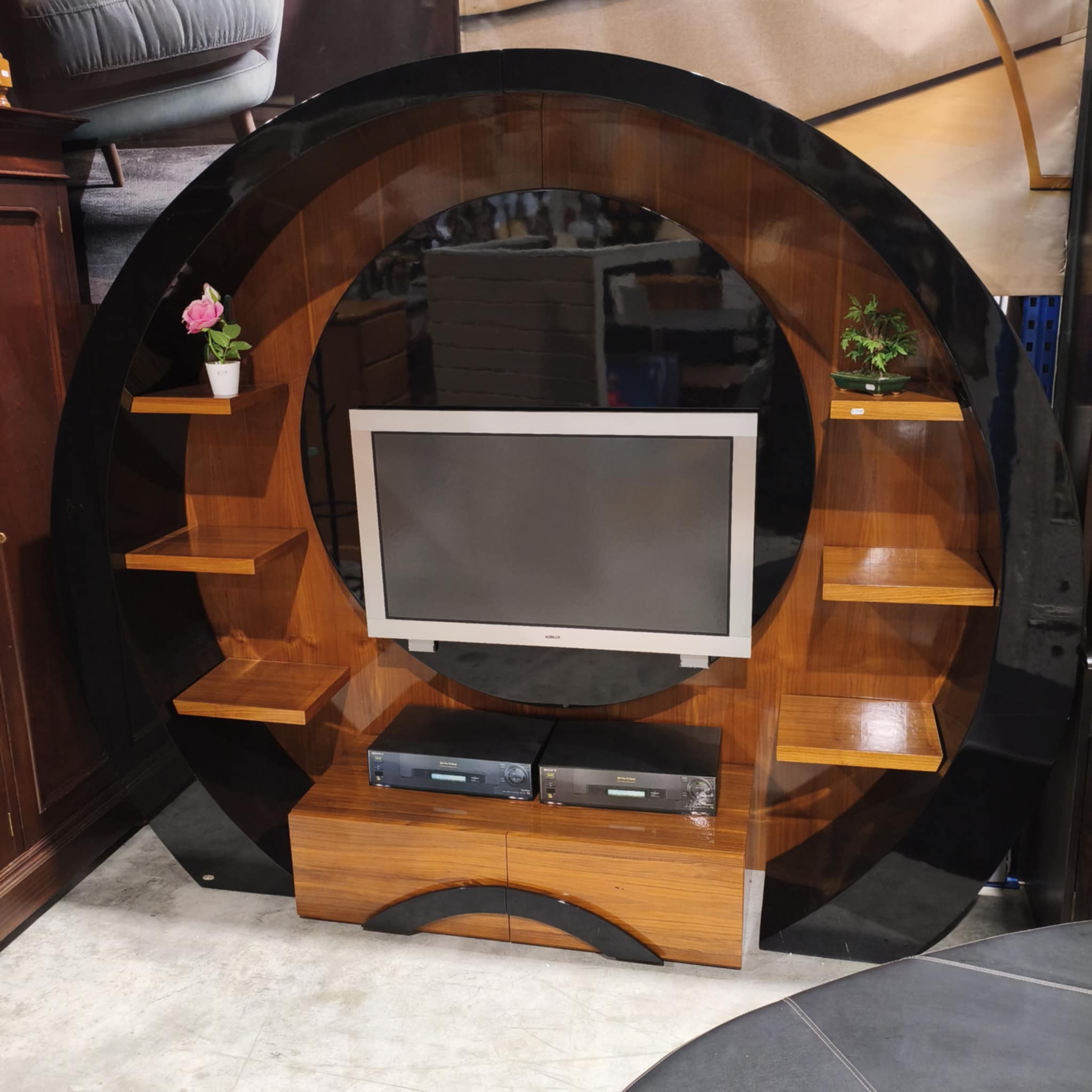 Móvel de TV/Multimédia arredondado, em cor mel e preto.