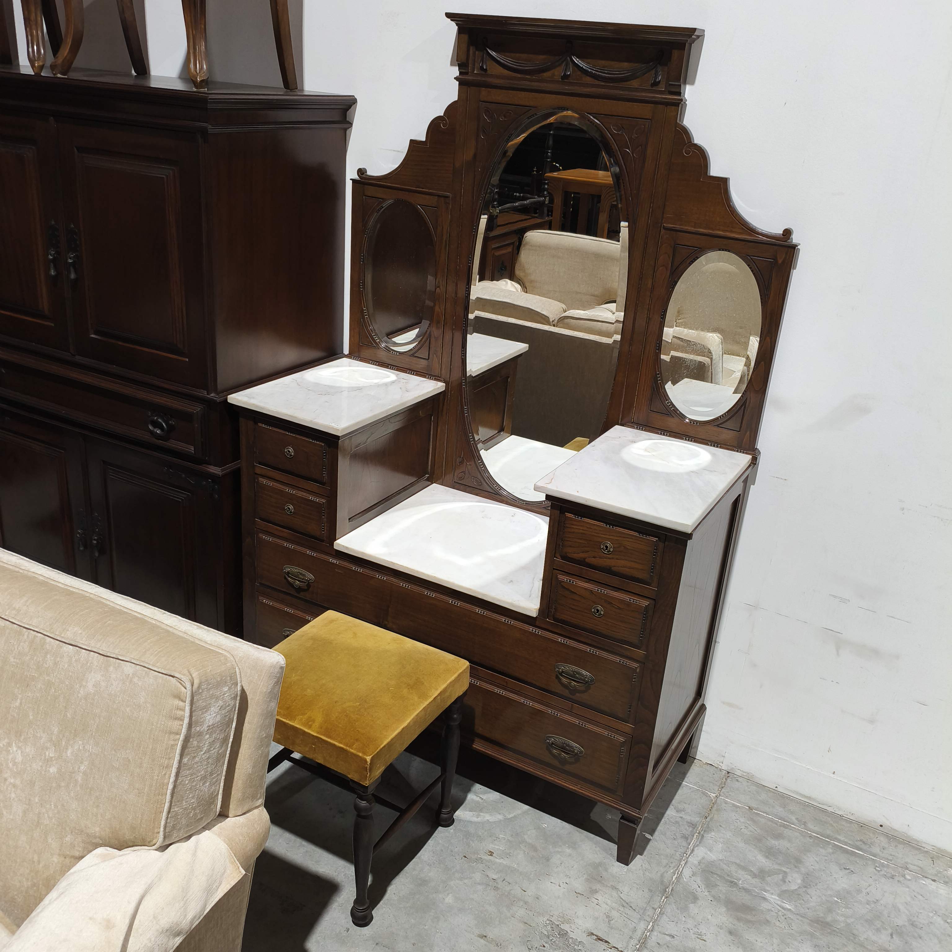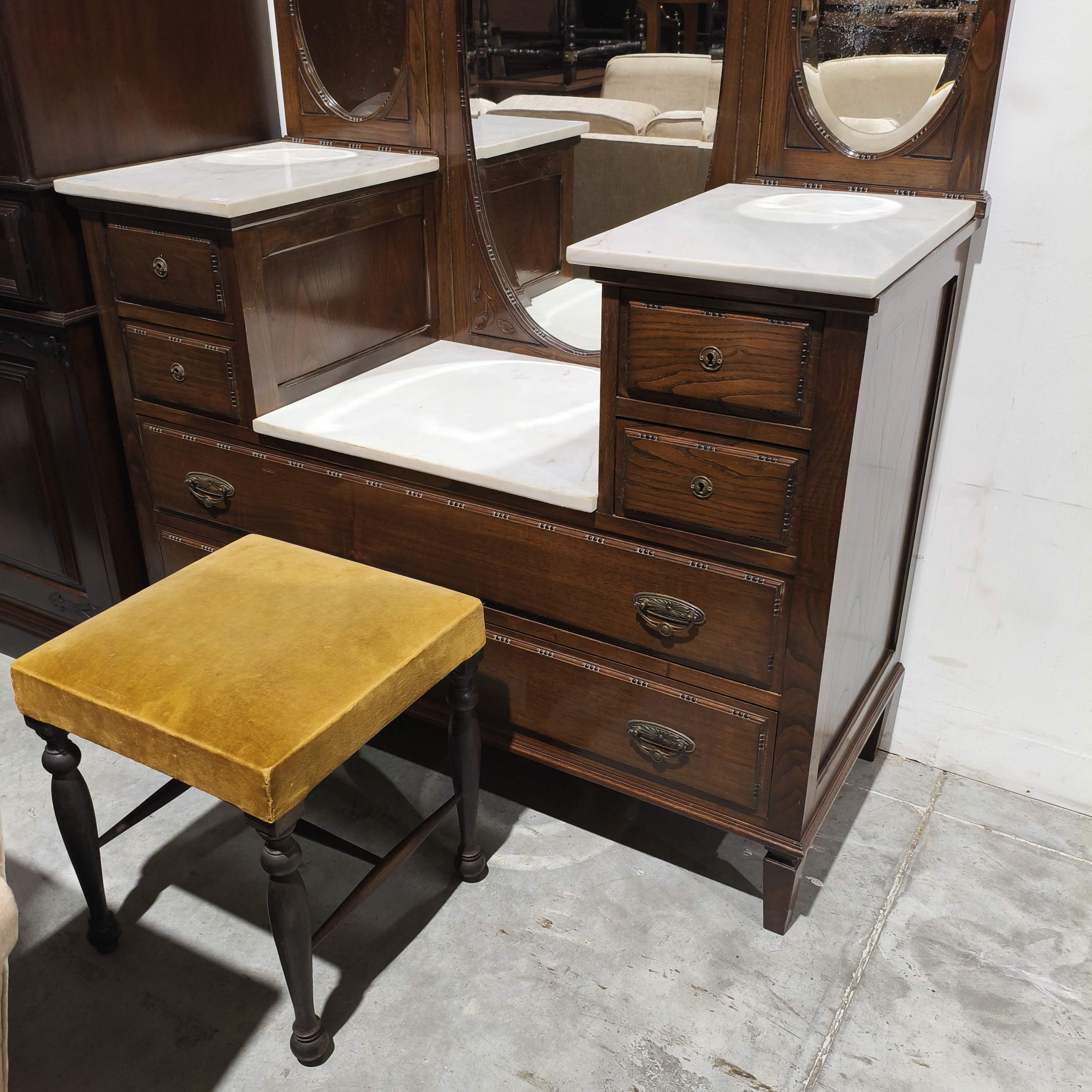 Penteadeira em castanho, com banco incluído.