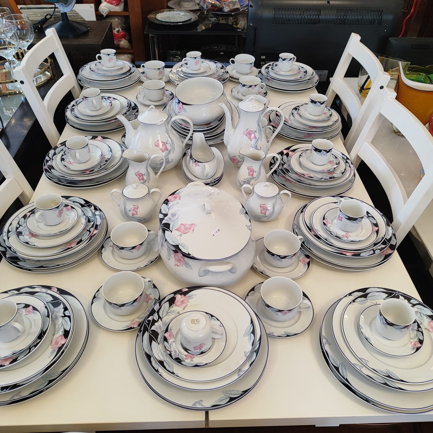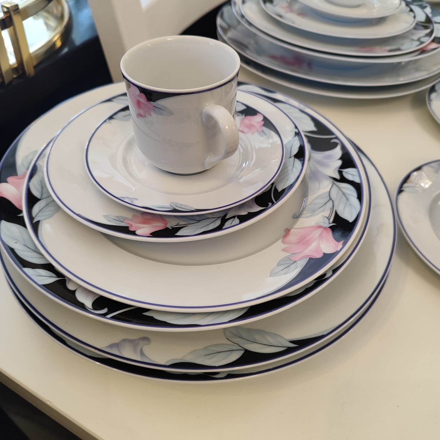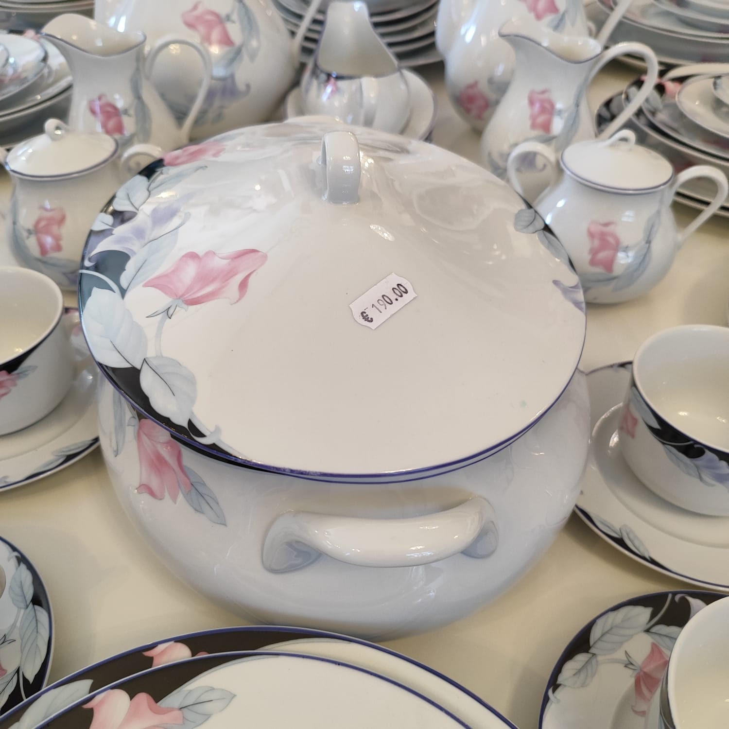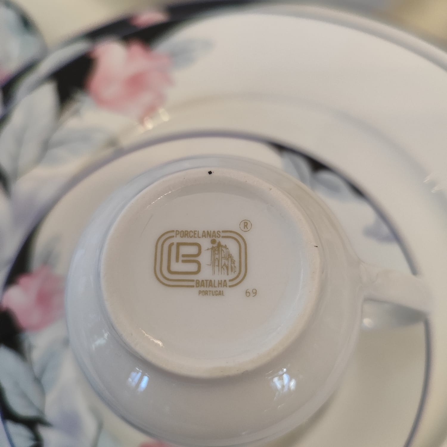Serviço de louça marca Porcelanas Batalha 24 pratos principal 12 pratos sopa 12 pratos entrada 10 pratos sobremesa 5 travessas 3 travessas pequenas 2 terrinas ( 1 sem tampa) 1 molheira 11 chávenas chá com pires 1 bule chá 1 açucareiro chá 1 leiteira chá 12 chávenas café com pires 1 bule café 1 leiteira café 1 açucareiro cafe