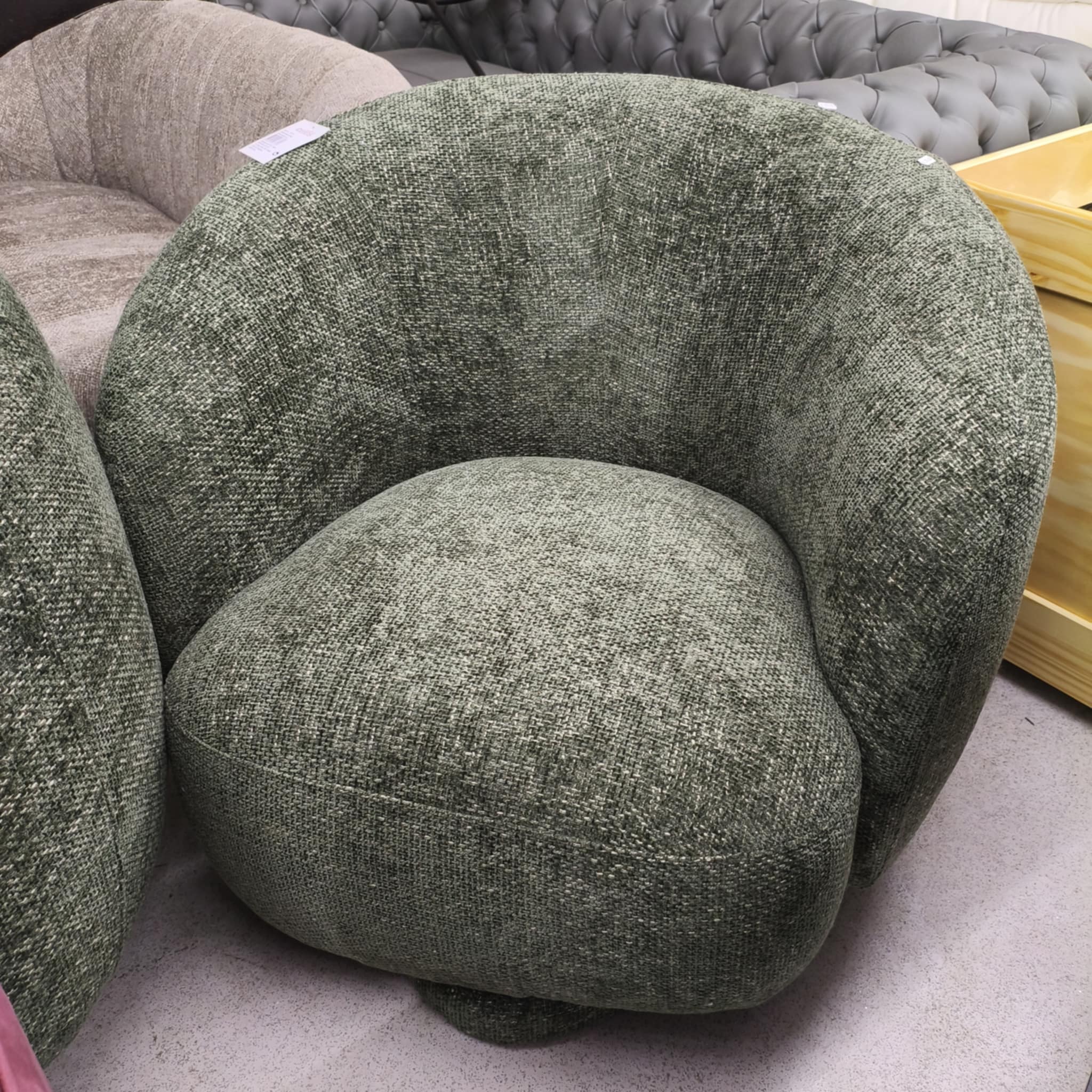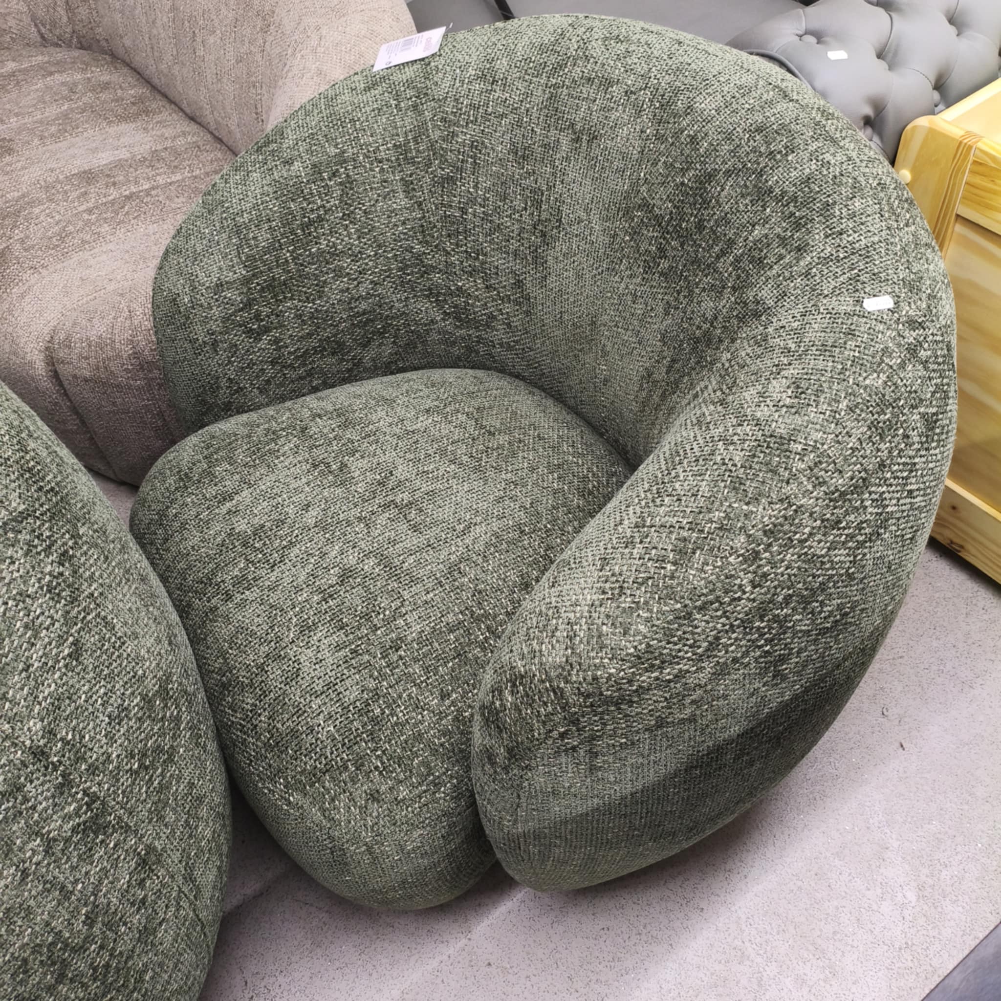 Sofá individual em tecido bouclé verde, rotativo.